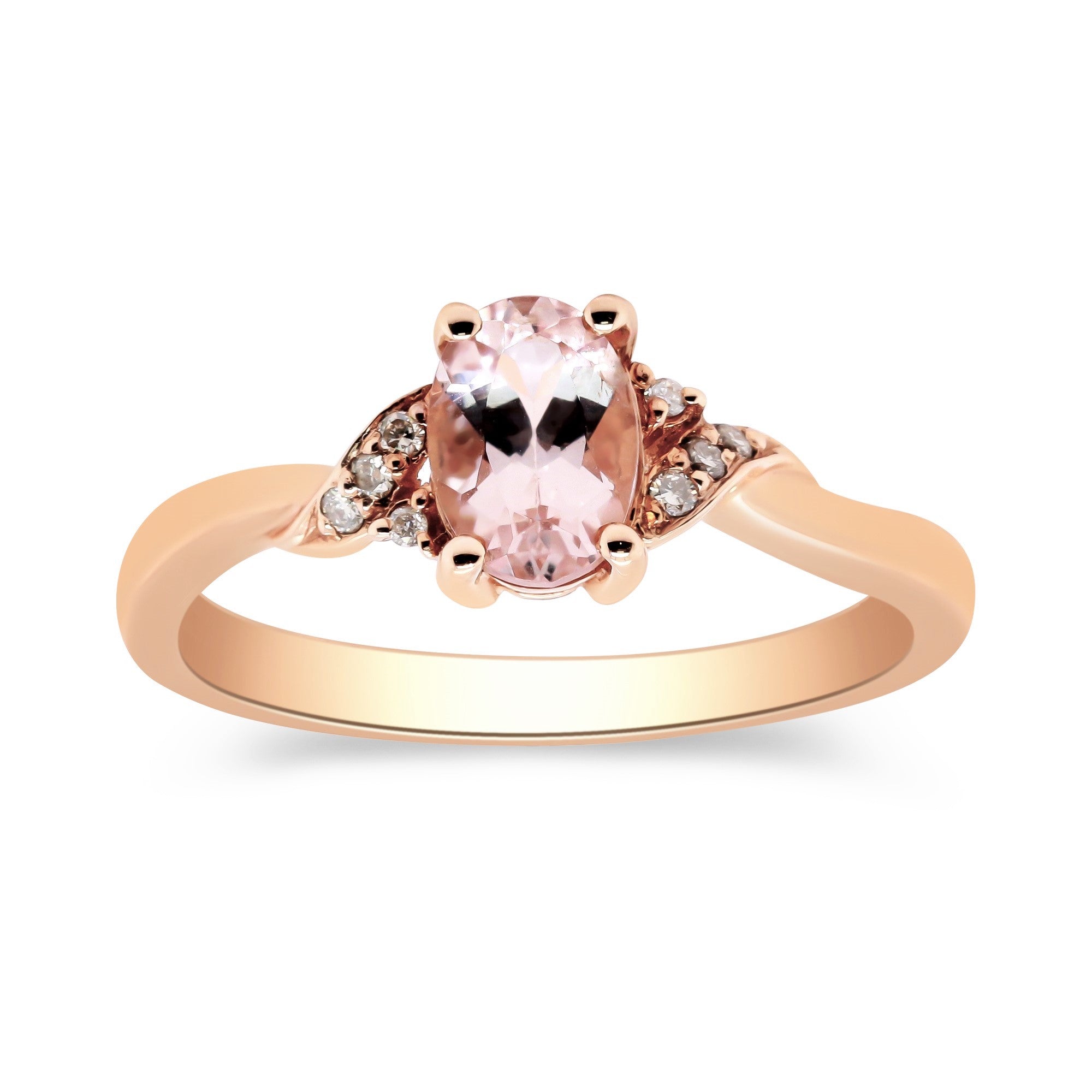 This gorgeous ring is crafted of 10-karat rose gold with an oval-cut Gin & Grace Genuine morganite center stone accented by sparkling diamond accents. A high polish finish gives this piece a radiant shine. Gemstone colors: Pink Gemstone shapes: Oval One prong-set oval-cut Genuine morganite measures 5 mm wide x 7 mm long Total gemstone weight: 3/4 carats Diamonds: Eight Diamond cut: Natural Round Diamond measurements: 1 mm Diamond weight: 0.04 carat Color: G-H Clarity: I1-I2 Setting: Prong Metal: 10k rose gold Finish: High polish Metal weight: 2.19 grams Ring setting dimensions: 18 mm wide x 23 mm long x 4 mm high Band dimensions: 2 mm wide