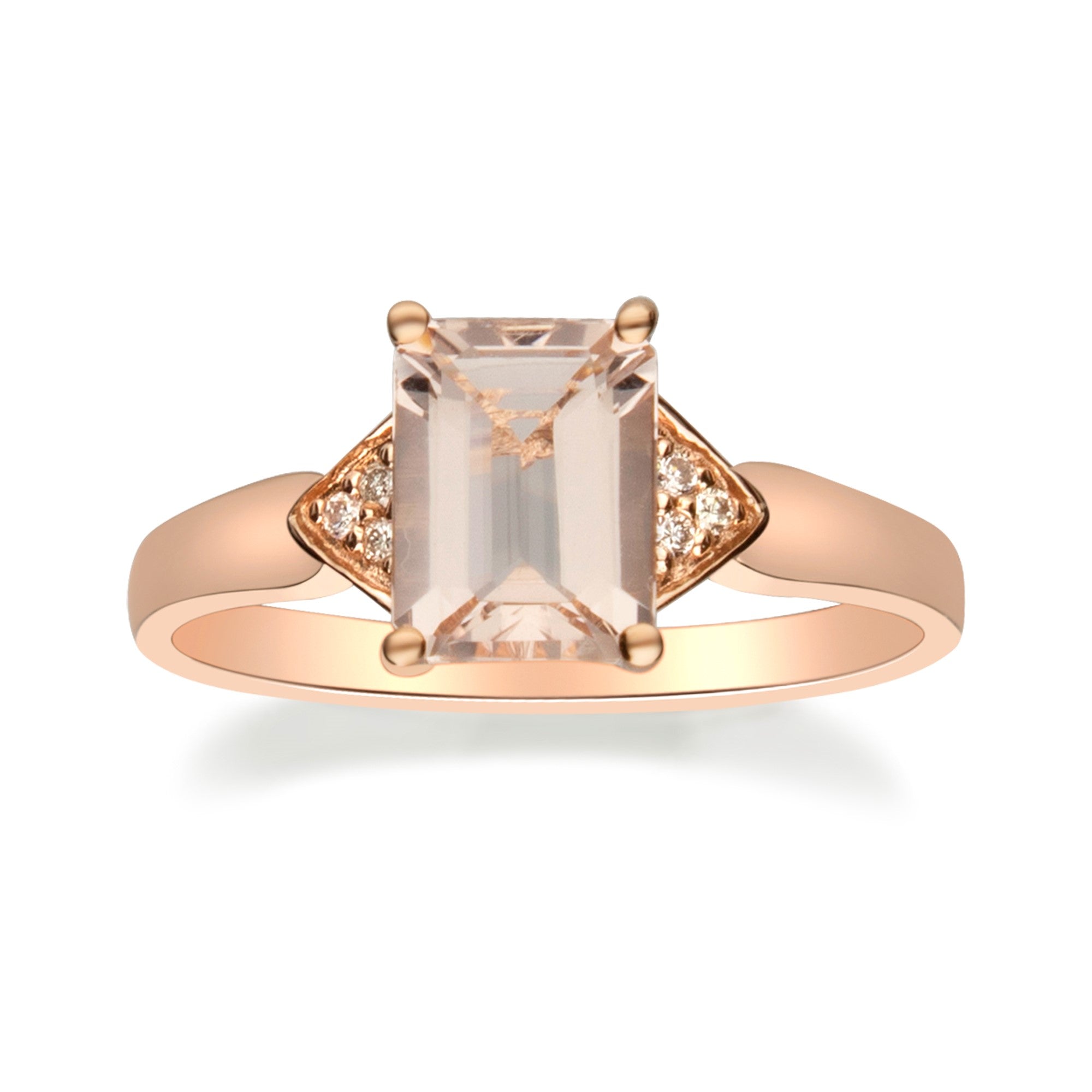 Decorate yourself in elegance with this Ring is crafted from 14-karat Rose Gold by Gin & Grace. This Ring is made up of 6x8 mm Emerald-Cut (1 pcs) 1.28 carat Madagascar Morganite and Round-cut White Diamond (6 Pcs) 0.04 Carat. This Ring is weight 1.80 grams. This delicate Ring is polished to a high finish shine.