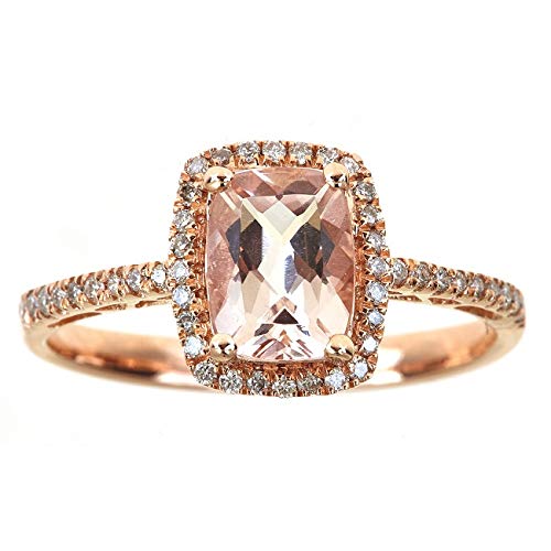 Wrapped in stunning white diamonds, the large Gin & Grace Genuine Madagascar Morganite gemstone of this ring catches the light effortlessly and adds subtle color to this gorgeous jewelry. Crafted beautifully, this cushion-cut ring is the perfect way to stay trendy and timeless at the same time. Gemstone colors: Pink Gemstone shapes: Cushion One prong-set Cushion-cut Genuine Madagascar Morganite measures 6 mm wide x 8 mm long Gemstone weight: 1 3/10 carats Total gemstone weight: 1 3/10 carats Diamonds: 46 Diamond cut: Natural Round Diamond measurements: Each measures 1 mm Diamond weight: 1/5 carat Color: G-H Clarity: I1-I2 Setting: Prong Metal: 10k Rose gold Finish: High polish Metal weight: 1.85 grams Ring setting dimensions: 18 mm wide x 22 mm long x 5 mm deep Band dimensions: 2 mm wid