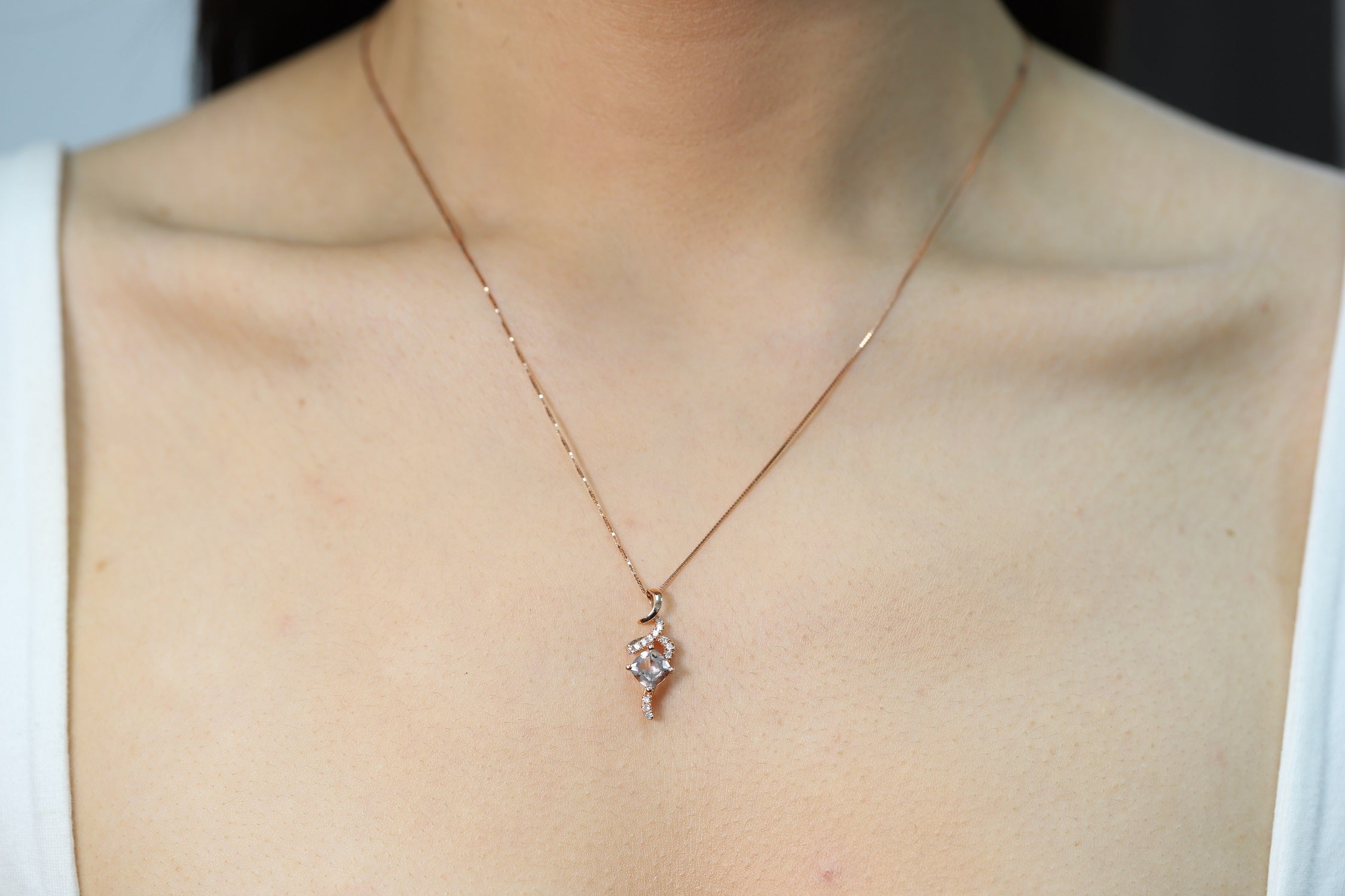 Decorate yourself in elegance with this Pendant is crafted from 10-karat Rose Gold by Gin & Grace Pendant. This Pendant is made up of 6MM Cushion-Cut Prong setting Genuine Madagascar Morganite (1 Pcs) 0.87 Carat and Round-Cut Prong setting Natural White Diamond (13 Pcs) 0.12 Carat. This Pendant is weight 0.75 grams. The gorgeous Pendant hangs from an 18-inch wheat chain. This delicate Pendant is polished to a high finish shine.