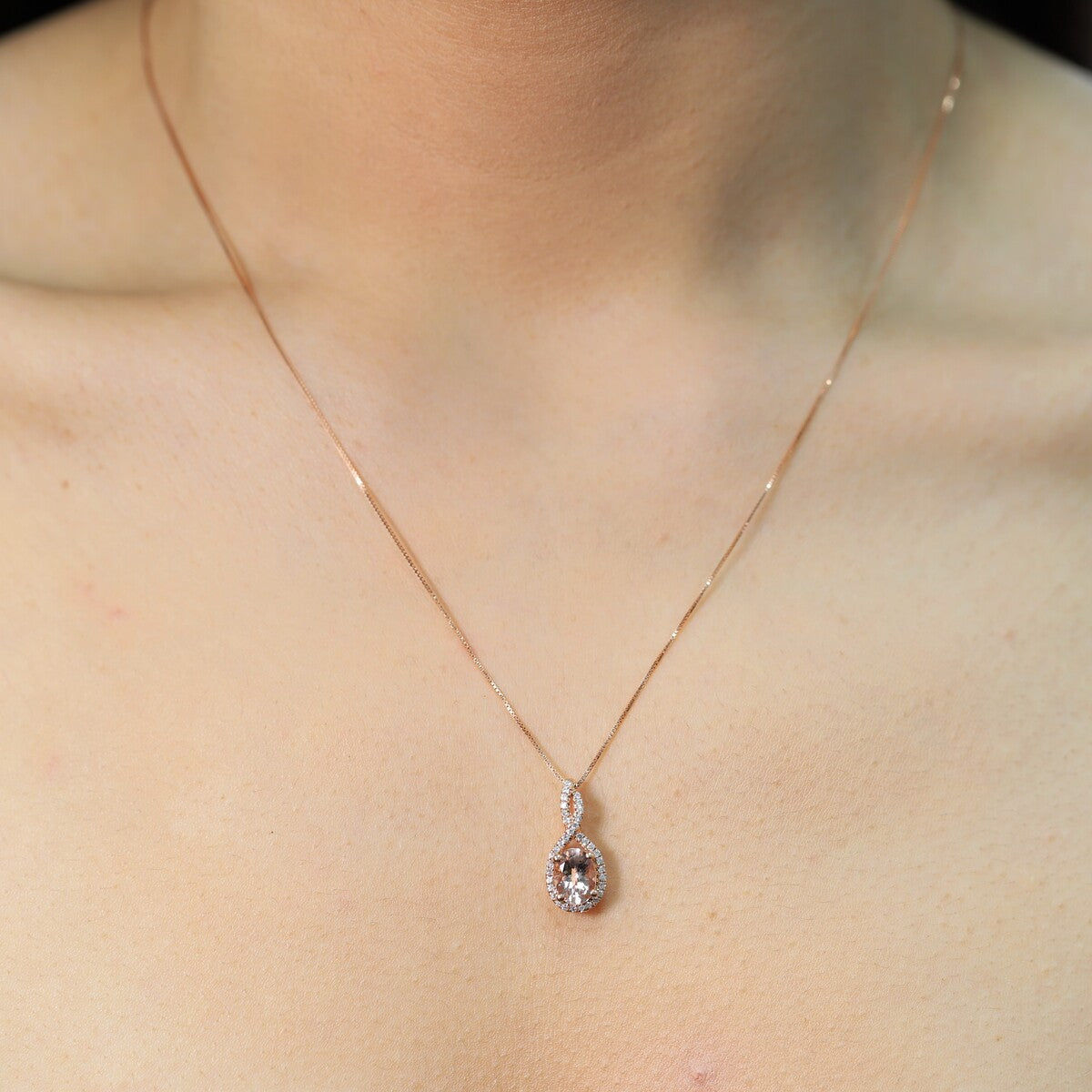 Decorate yourself in elegance with this Pendant is crafted from 10-karat Rose Gold by Gin & Grace Pendant. This Pendant is made up of 6X8 Oval-Cut Prong setting Genuine Genuine Madagascar Morganite (1 Pcs) 1.07 Carat and Round-Cut Prong setting Natural White Diamond (36 Pcs) 0.18 Carat. This Pendant is weight 1.07 grams. The gorgeous Pendant hangs from a 18-inch wheat chain. This delicate Pendant is polished to a high finish shine.