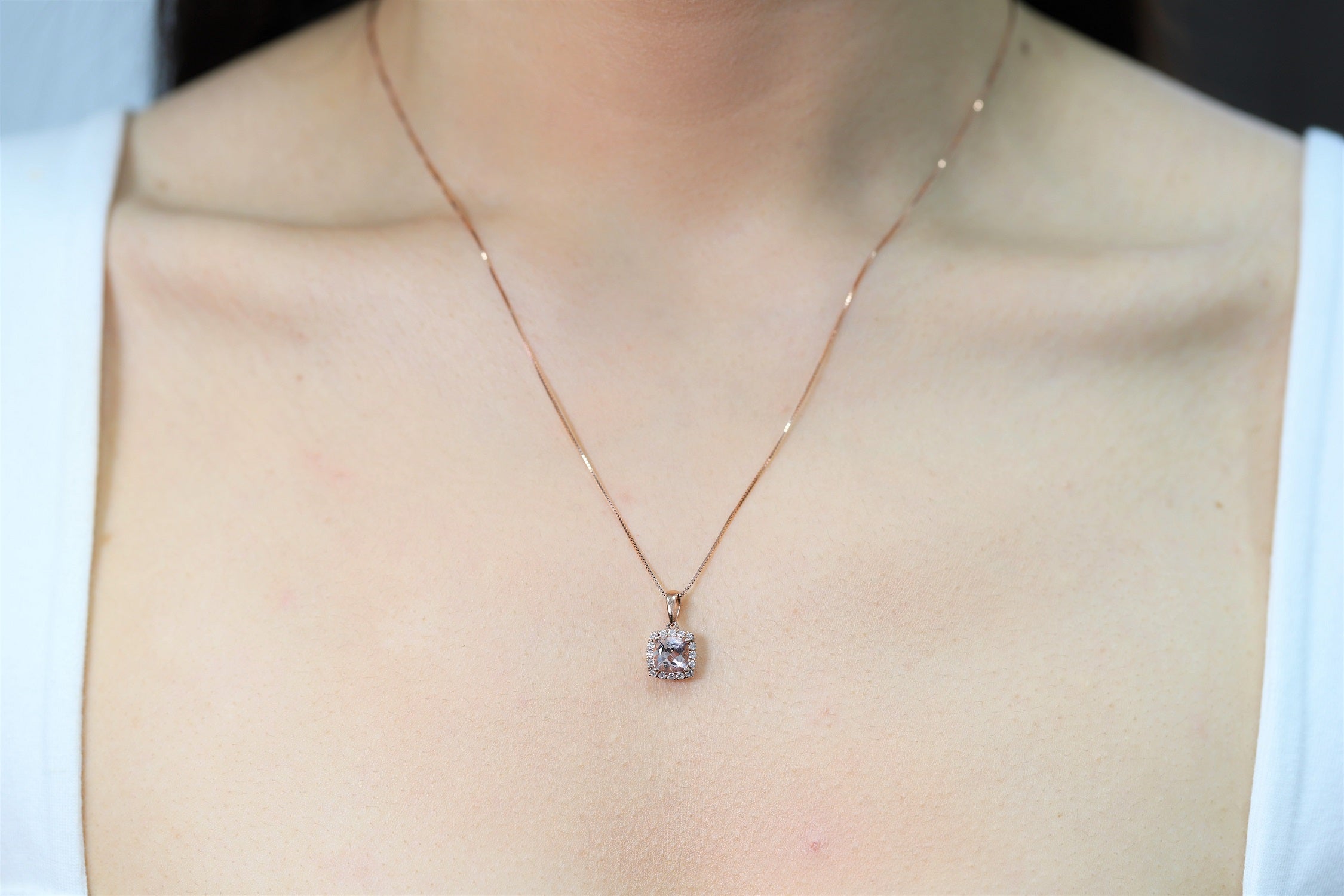 Decorate yourself in elegance with this Pendant is crafted from 10-karat Rose Gold by Gin & Grace Pendant. This Pendant is made up of 6MM Cushion-Cut Prong setting Genuine Madagascar Morganite (1 Pcs) 0.94 Carat and Round-Cut Prong setting White Diamond (16 Pcs) 0.17 Carat. This Pendant is weight 1.61 grams. The gorgeous Pendant hangs from a 18-inch wheat chain. This delicate Pendant is polished to a high finish shine.