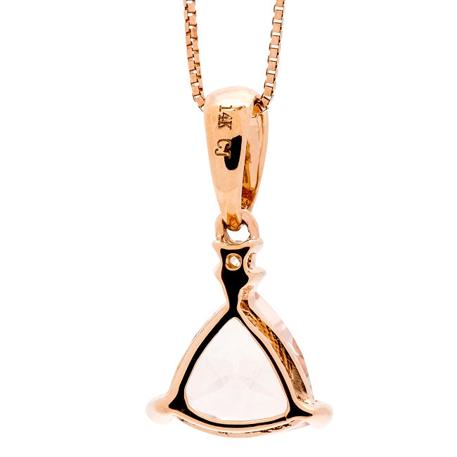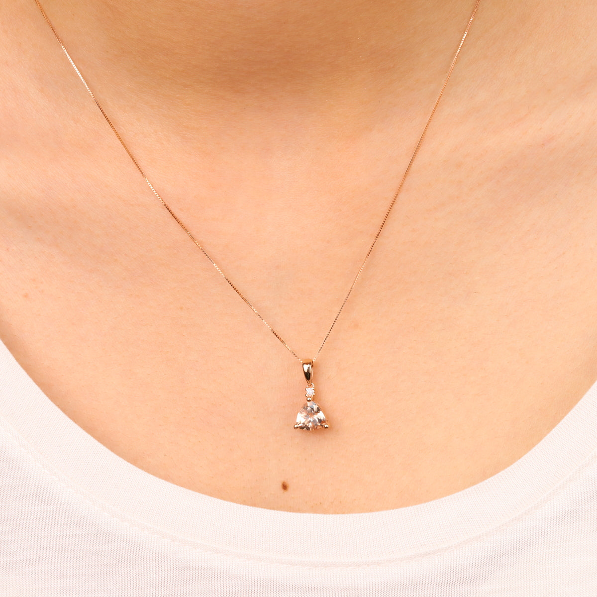 A trillion-cut Madagascar Morganite is placed at the bottom of this pendant for sparkle and color completed with one single brilliant diamond. This necklace is polished and features a secure spring ring clasp. Details 1 prong-set trillion-cut Gin & Grace Genuine Madagascar Morganite each measure 8 mm wide x 8 mm long Total gemstone weight: 1.52 Carat 1 round-cut measure 1 mm Color is G-H, clarity is I1-I2 Setting: Prong-set 10k rose gold High polish Chain length: 1 mm wide x 18 mm inches long Spring ring clasp Metal weight: 0.53 GM Pendant dimensions: 10 mm wide x 15 mm long x 4 mm deep.