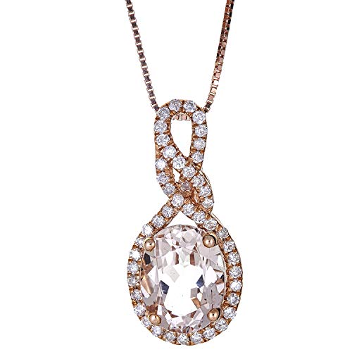 A huge Gin & Grace Madagascar Morganite gemstone is set in the center of this beautiful pendant and diamonds are encrusted along the face for an elegant and sophisticated look. The 14k rose gold is glossy for an eye-catching shine. Style: Pendant Gemstone colors: Pink Gemstone shapes: Oval-cut One prong-set Oval-cut measure Genuine Madagascar Morganite 7 mm wide x 9 mm long Gemstone weight: 1 3/4 Carat Total gemstone weight: 1 3/4 Carat Diamonds:46 Diamond cut: Round-cut measure 1 mm Diamond weight: 1/4 Carat Color: G-H Clarity: I1-I2 Setting: Prong-set Metal: 14K Rose gold Finish: High Polish Chain: Box Chain length: 1 mm wide x 18 mm inches long Clasp: Spring Pendant Metal weight: 1.5 GM Pendant dimensions: 9 mm wide x 15 mm long x 4 mm deep.