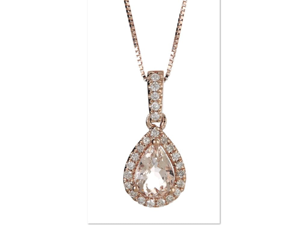 Decorate yourself in luxury with this Gin & Grace Pendant. The jewelry boasts pear-cut Genuine Madagascar Morganite and diamond accent stones for a lovely design. Style: Pendant Gemstone colors: Pink Gemstone shapes: Pear-cut One prong-set pear-cut measure 5 mm wide x 7 mm long Gemstone weight: 3/5 Carat Total gemstone weight: 3/5 Carat Diamonds:24 Diamond cut: Round-cut measure 1 mm Diamond weight: 0.125 Carat Color: G-H Clarity: I1-I2 Setting: Prong-set Metal: 14K rose gold Finish: High polish Chain: Box Chain length: 1 Mm wide x 18 mm inches long Clasp: Spring Pendant Metal weight: 0.82 Gm Pendant dimensions: 4 Mm wide x 13 mm long x 4 mm deep