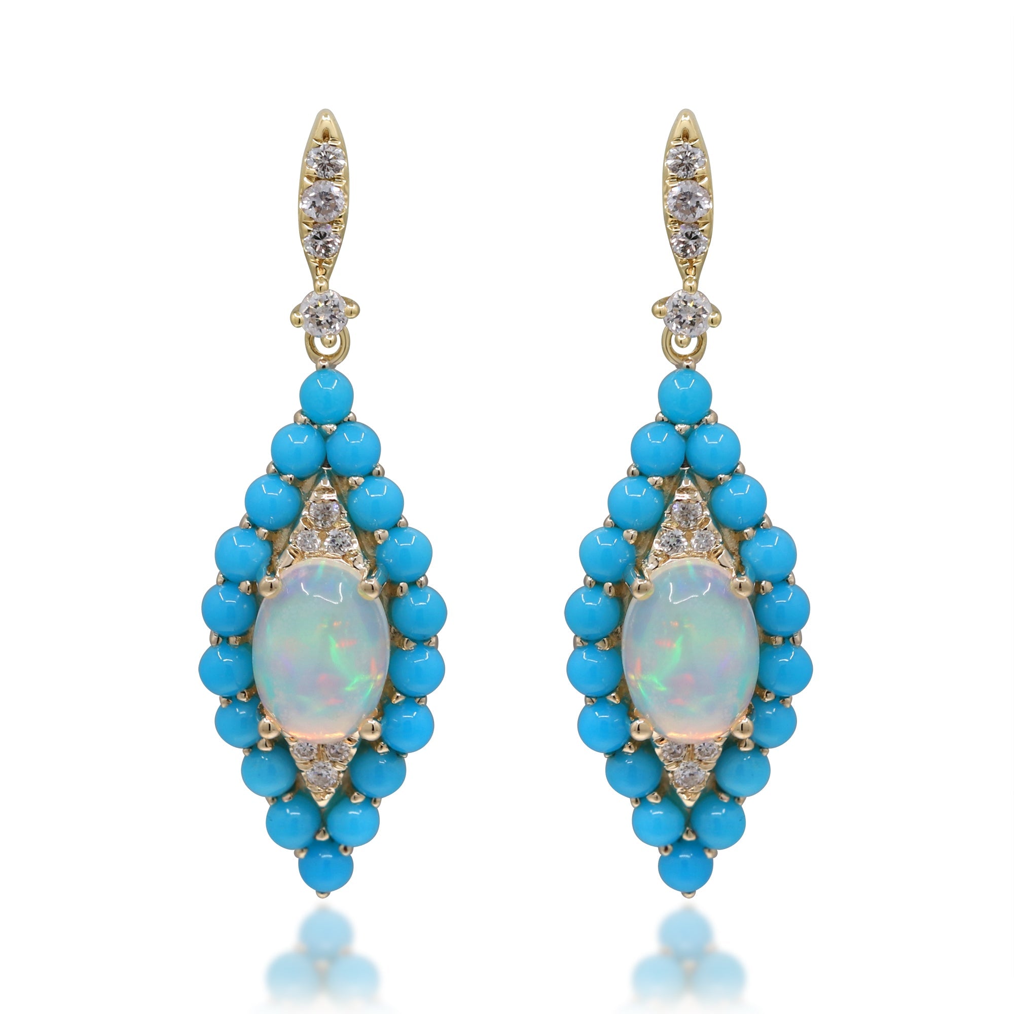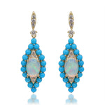 Decorate yourself in elegance with this Earring is crafted from 14K Yellow Gold by Gin & Grace. This Earring is made up of Oval-Cut African Opal (2 pcs) 1.08 carat, Round-cut Turquoise (36 pcs) 1.54 carat and Round-cut White Diamond (20 Pcs) 0.16 Carat. This Earring is weight 3.95 grams. This delicate Earring is polished to a high finish shine.