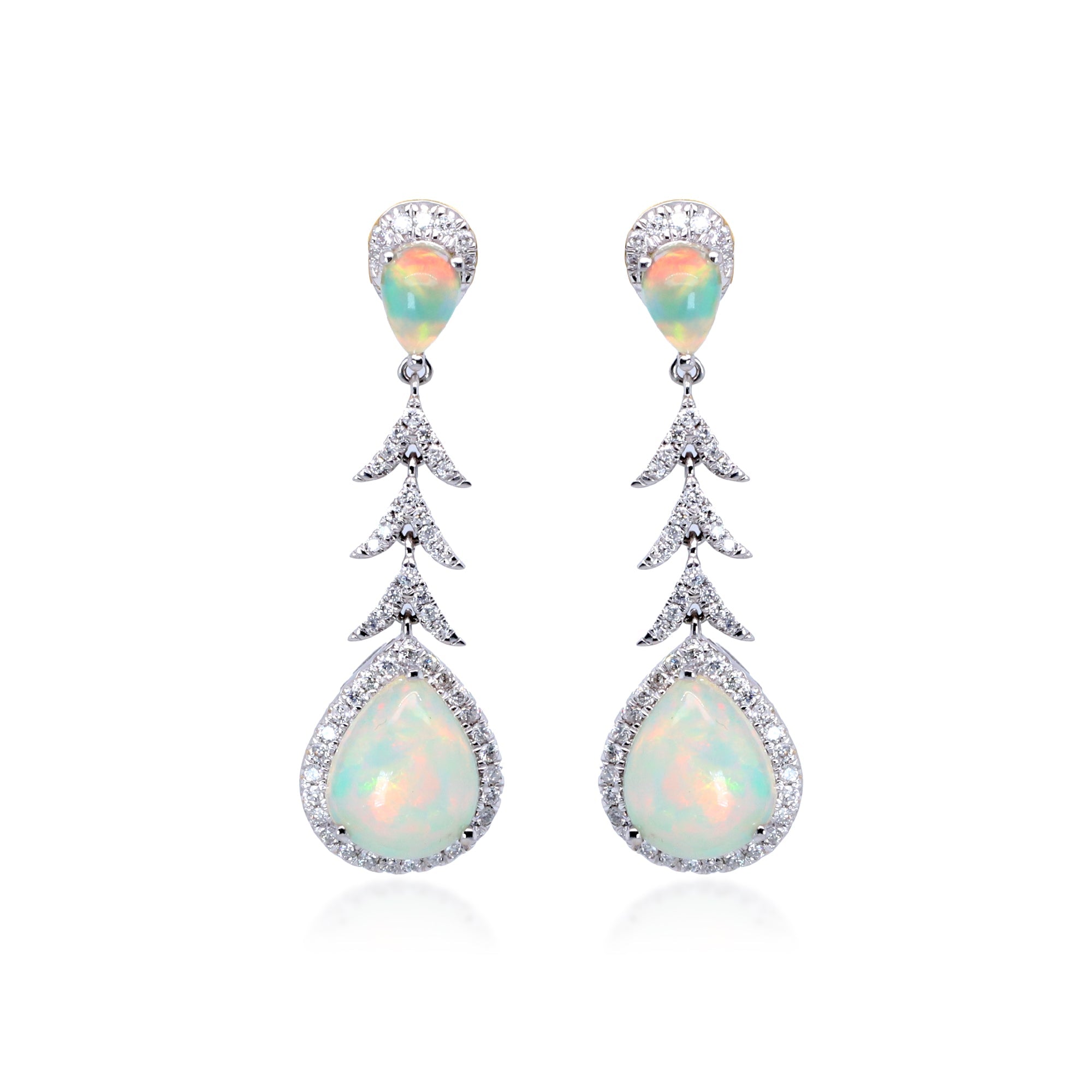 Decorate yourself in elegance with this Earring is crafted from 14-karat White Gold by Gin & Grace. This Earring is made up of 8x10 Pear-cut African Opal (2 pcs) 3.06 carat, 6x4 Pear-cut African Opal (2 pcs) 0.62 carat and Round-cut White Diamond (110 Pcs) 0.49 Carat. This Earring is weight 4.52 grams. This delicate Earring is polished to a high finish shine.