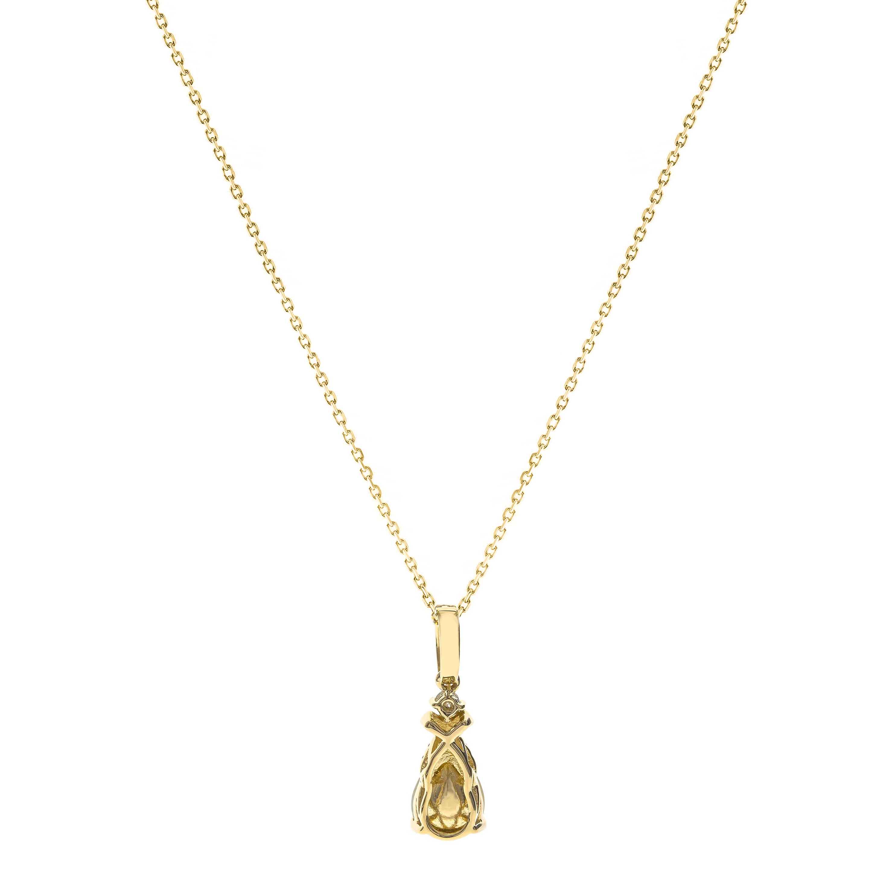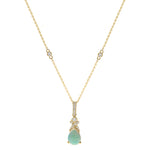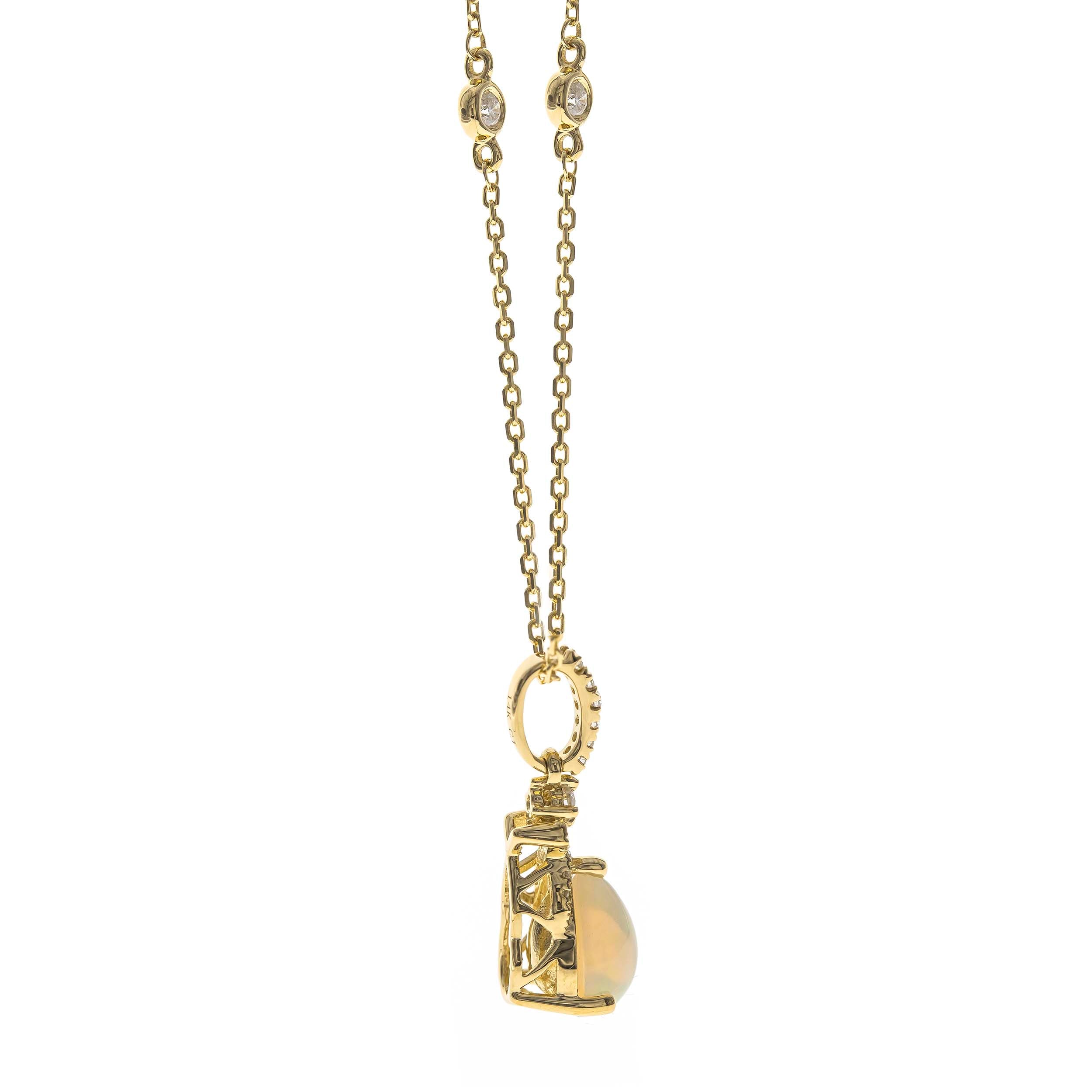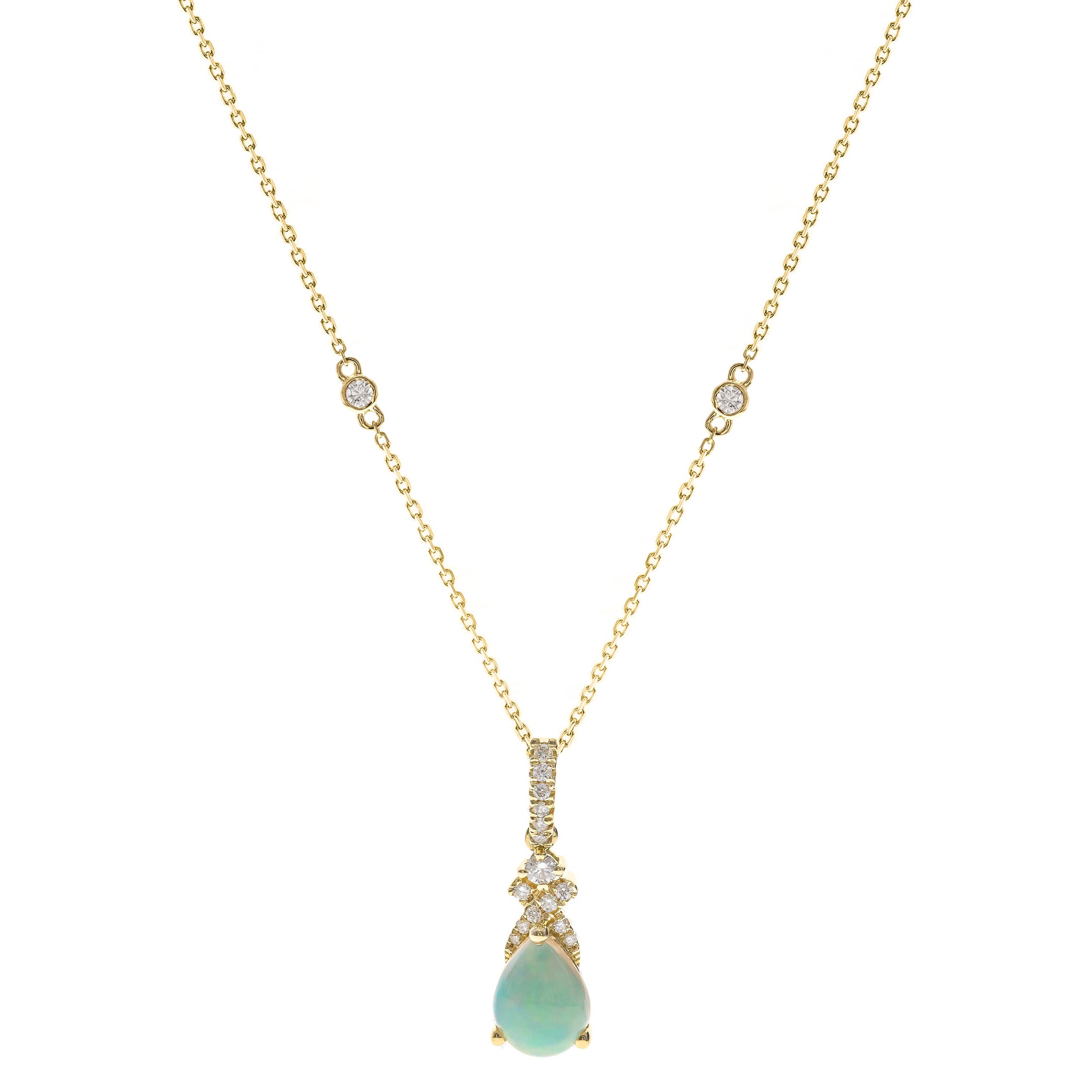 Decorate yourself in elegance with this Pendant is crafted from 14-karat Yellow Gold by Gin & Grace Pendant. This Pendant is made up of 6X8 mm Pear-cut Cabochon setting Natural African Opal (1 Pcs) 0.88 Carat and Round-Cut Prong setting Natural White Diamond (17 Pcs) 0.12 Carat. This Pendant is weight 1.75 grams. The gorgeous Pendant hangs from a 18-inch wheat chain. This delicate Pendant is polished to a high finish shine.