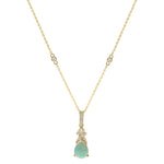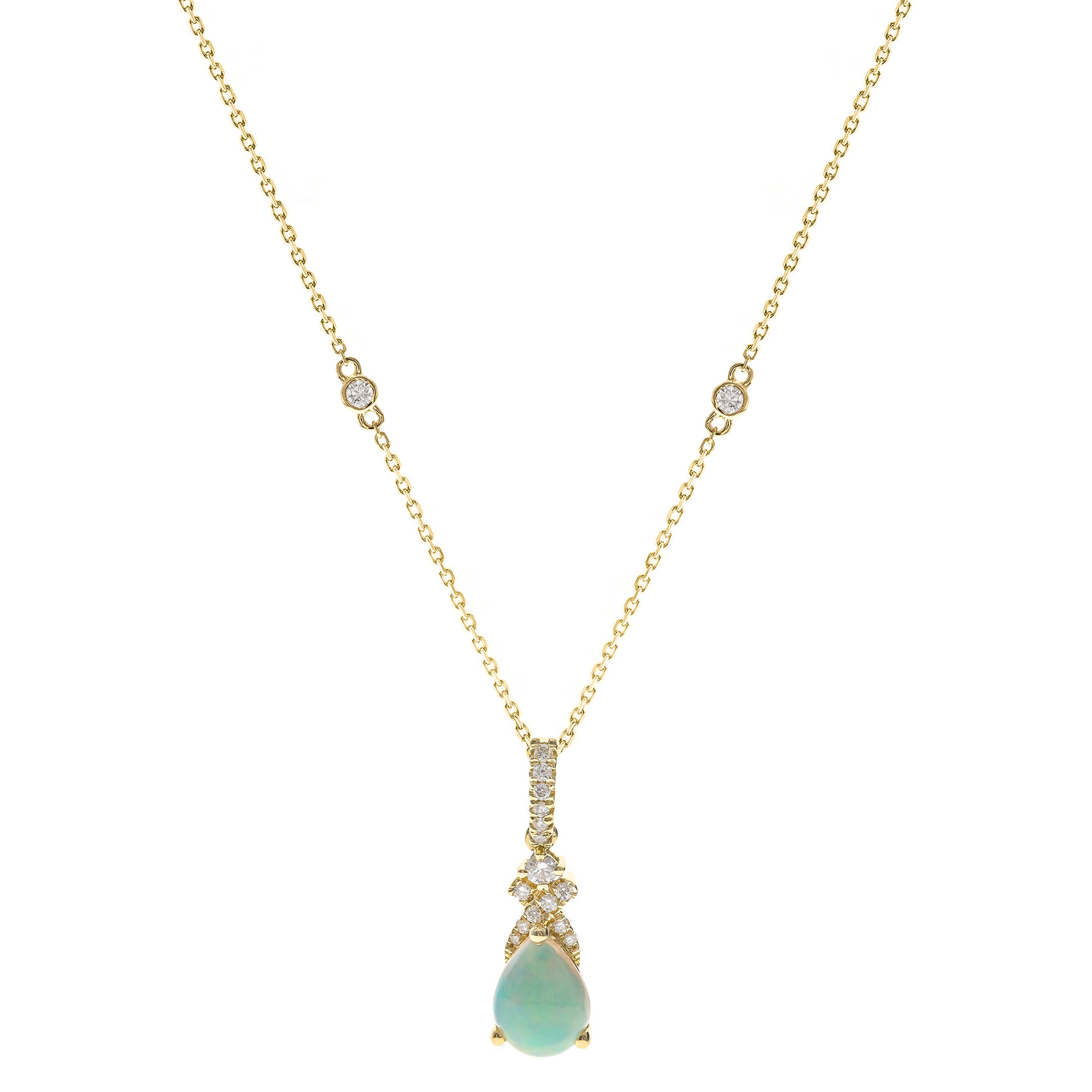 Decorate yourself in elegance with this Pendant is crafted from 14-karat Yellow Gold by Gin & Grace Pendant. This Pendant is made up of 6X8 mm Pear-cut Cabochon setting Natural African Opal (1 Pcs) 0.88 Carat and Round-Cut Prong setting Natural White Diamond (17 Pcs) 0.12 Carat. This Pendant is weight 1.75 grams. The gorgeous Pendant hangs from a 18-inch wheat chain. This delicate Pendant is polished to a high finish shine.