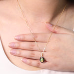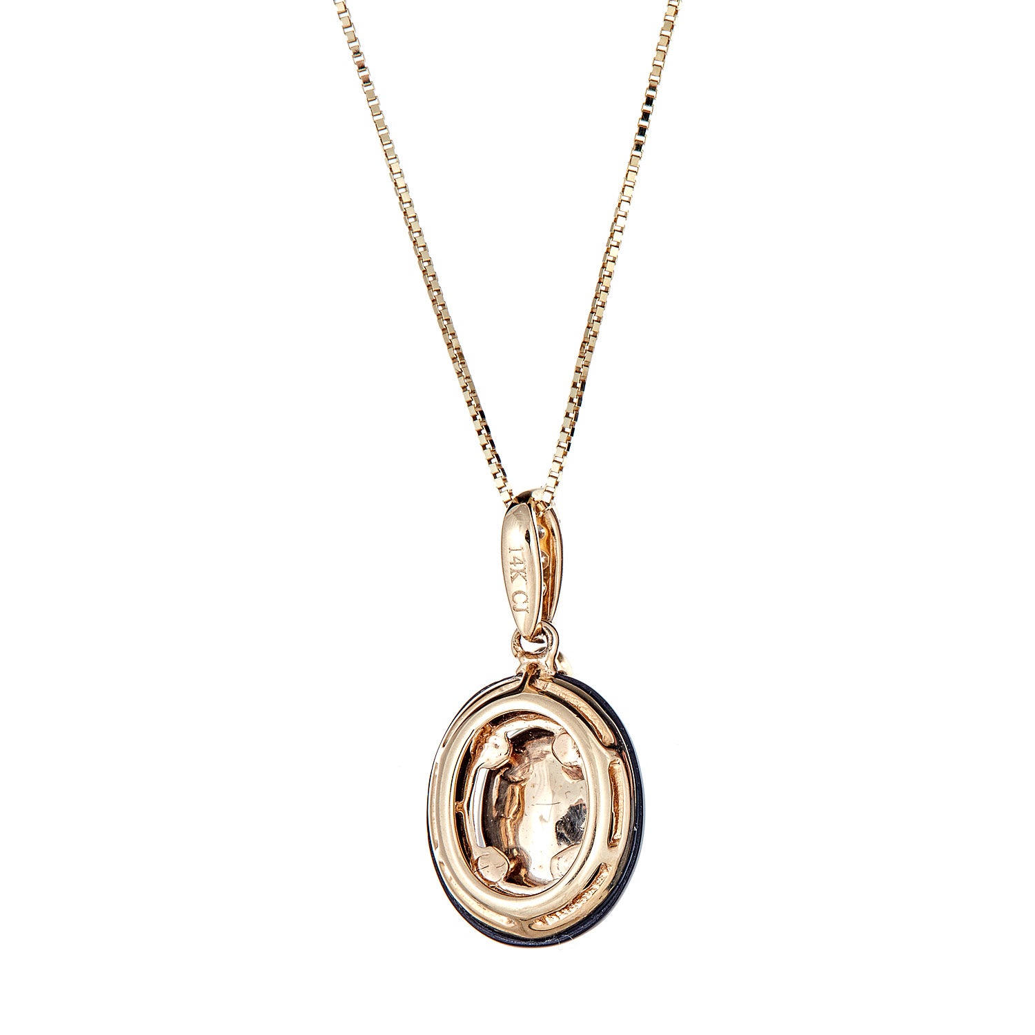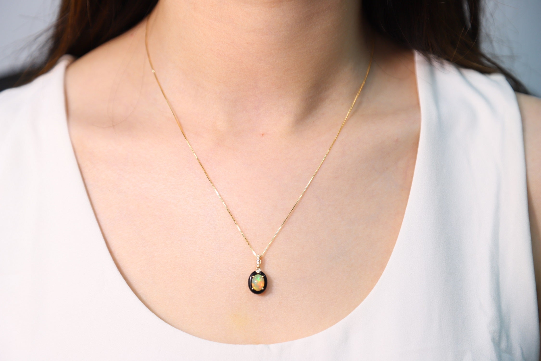 Decorate yourself in elegance with this Pendant is crafted from 14-karat Yellow Gold by Gin & Grace Pendant. This Pendant is made up of 6*8 Oval-cut Prong setting African Opal (1 Pcs) 0.76 Carat, onyx free free (1 Pcs) 0.95 carat and Round-Cut Prong setting White Diamond (6 Pcs) 0.03 Carat. This Pendant is weight 1.90 grams. The gorgeous Pendant hangs from a 18-inch wheat chain. This delicate Pendant is polished to a high finish shine.
