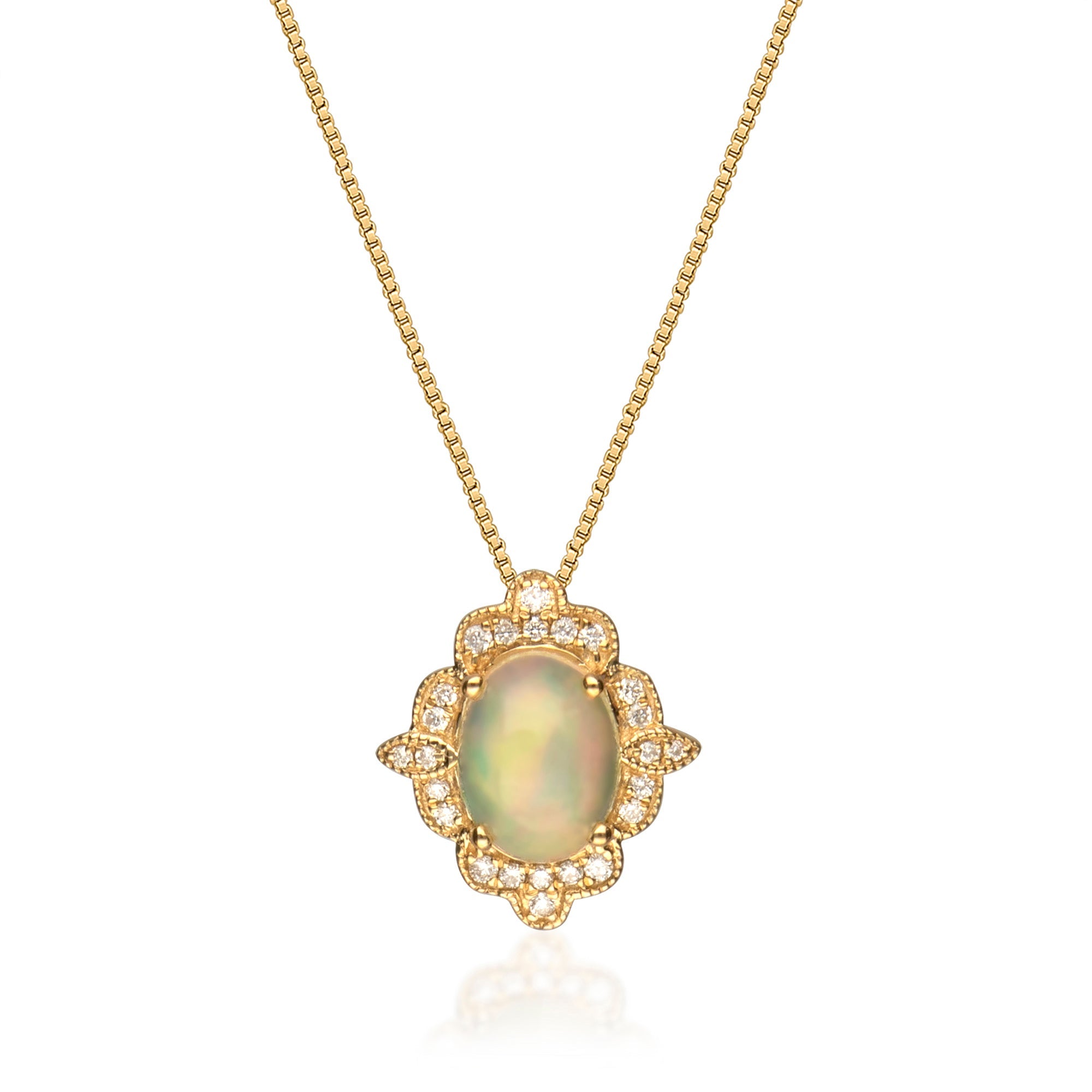 Stunning, timeless and classy eternity Unique Pendant. Decorate yourself in luxury with this Gin & Grace Pendant. This Pendant is made up of Oval-Cut Prong Setting Natural Opal (1 pc) 0.83 Carat and Round-Cut Prong Setting Diamond (24 pcs) 0.09 Carat accent stones for a lovely design. This pendant is weight 1.62 grams. The pendant is crafted of shining 10-karat Yellow Gold and is completed by a highly polished finish.