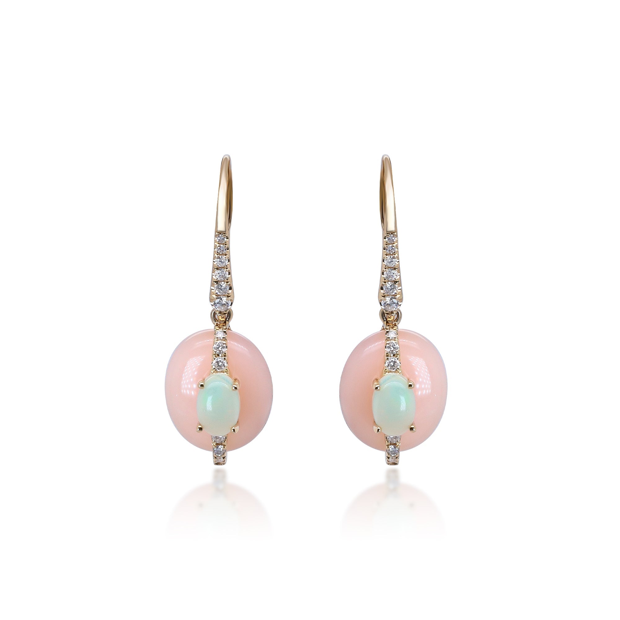 Decorate yourself in elegance with this Earring is crafted from 14-karat Yellow Gold by Gin & Grace. This Earring is made up of Ruby Oval shaped (2 pcs) 1.08 carat, Pink Opal Oval shaped (2 pcs) 4.82 carat Round-cut White Diamond (24 Pcs) 0.20 Carat. This Earring is weight 2.47 grams. This delicate Earring is polished to a high finish shine.