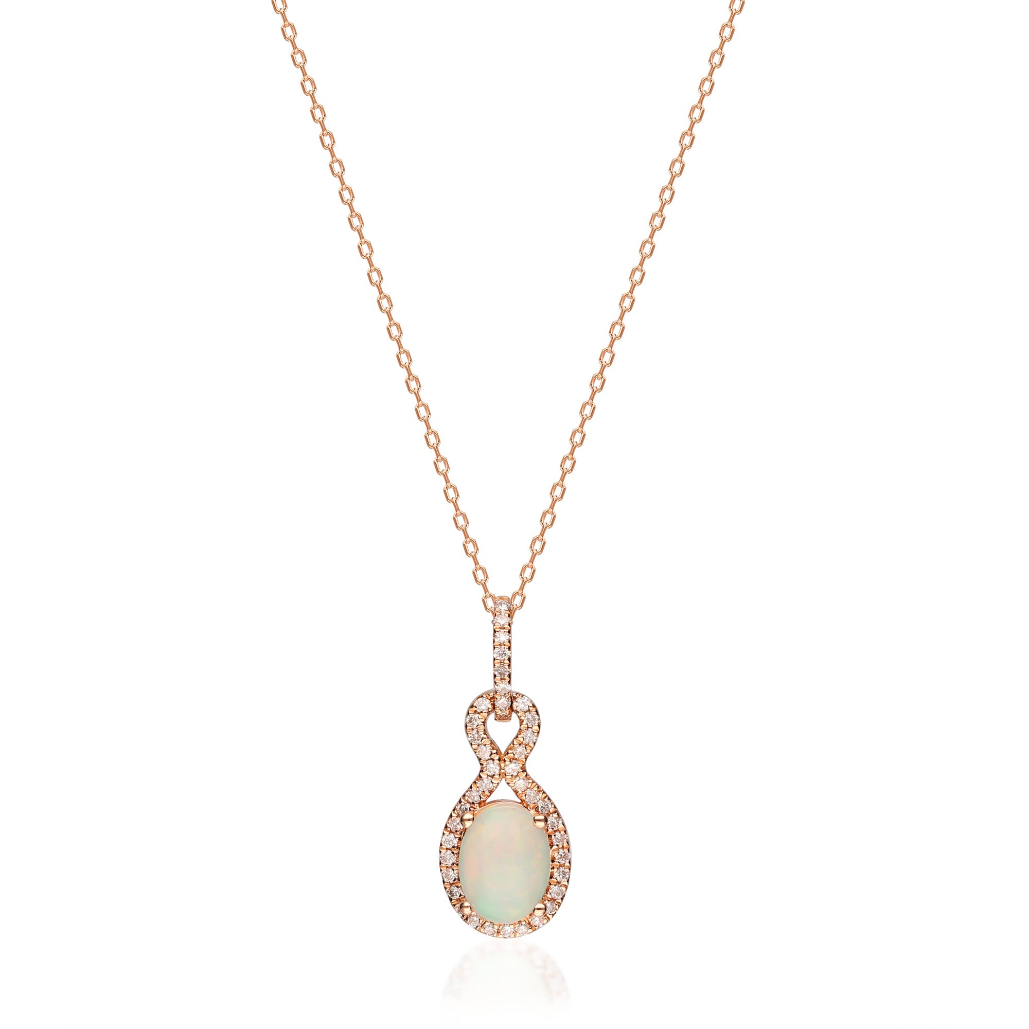 Decorate yourself in elegance with this Pendant crafted from 10-karat rose Gold by Gin & Grace. This Pendant is made up of 6*8 mm African Opal Oval-Cut (1 pcs ) 0.84 and Round-cut Diamond (41 Pcs) 0.20 carat. This Pendant weighs 1.40 grams. This delicate Pendant is polished to a high finish shine.