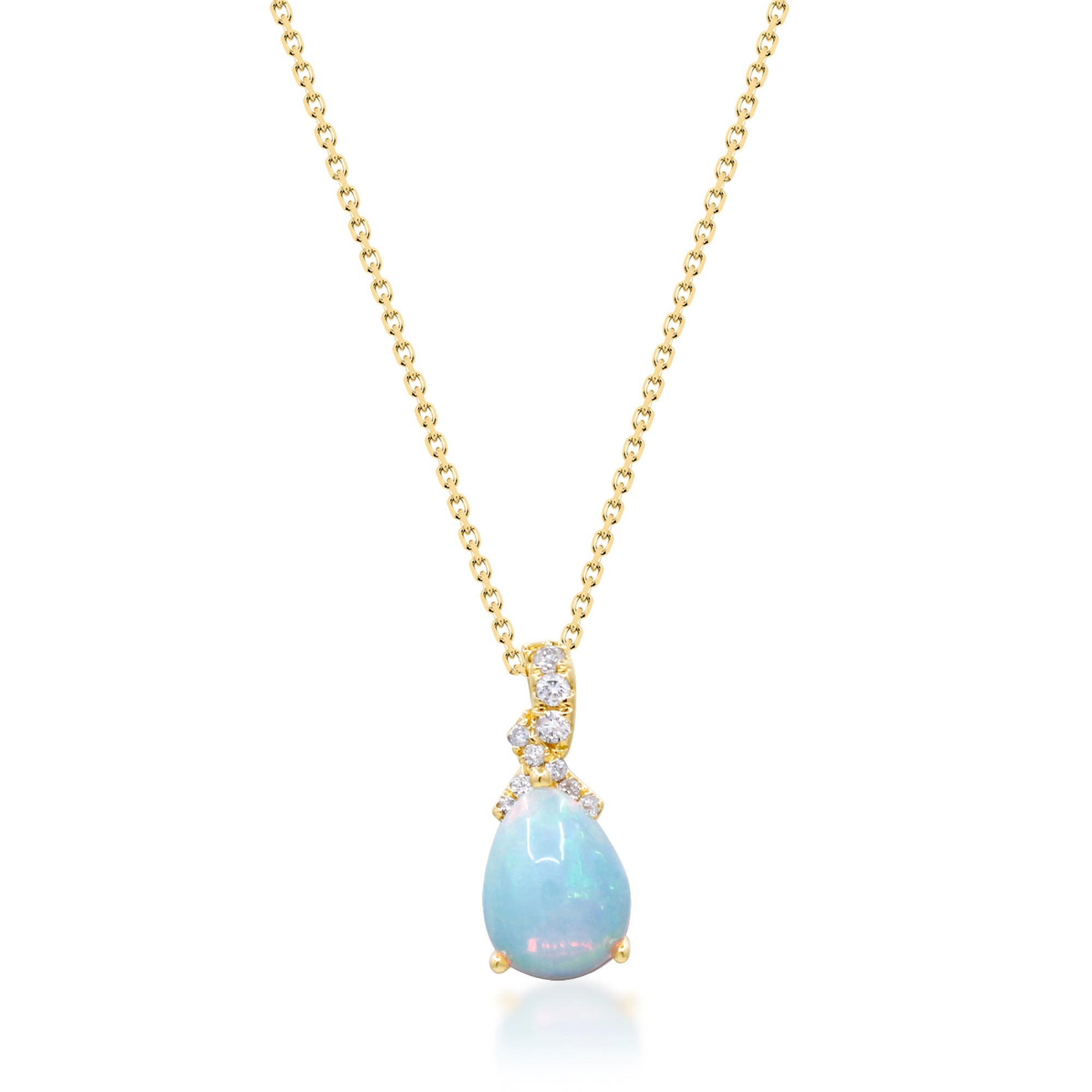 Decorate yourself in elegance with this Pendant is crafted from 10-karat Yellow Gold by Gin & Grace. This Pendant is made up of 9x7 mm Oval-Cab African Opal (1 pcs) 1.02 carat and Round-cut White Diamond (11 Pcs) 0.10 Carat. This Pendant is weight 2.01 grams. This delicate Pendant is polished to a high finish shine.