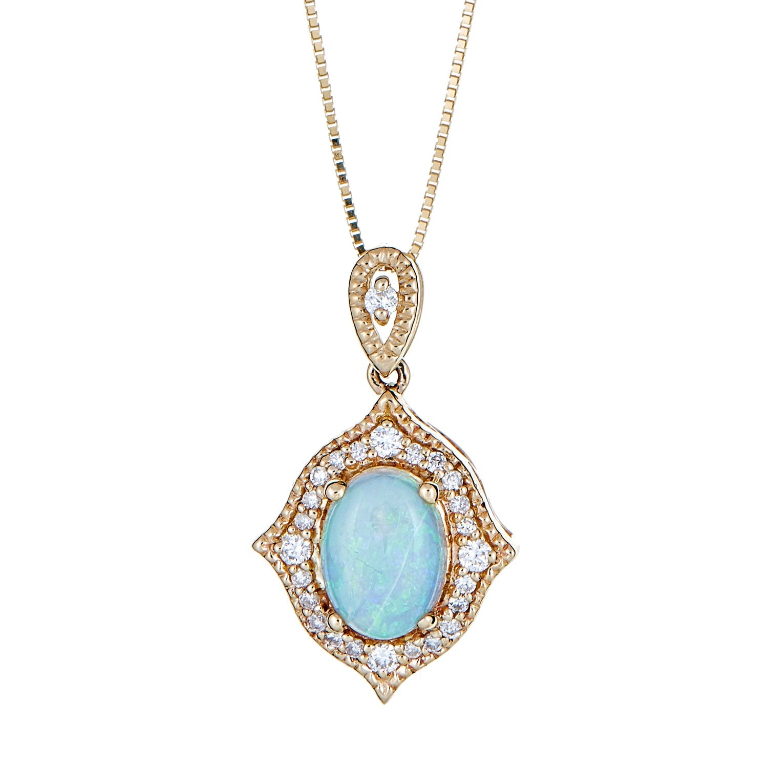 Decorate yourself in elegance with this Pendant is crafted from 14K Yellow Gold by Gin & Grace Pendant. This Pendant is made up of Oval-cut Prong setting Ethiopian opal (1 Pcs) 0.85 Carat and Round-Cut Prong setting White Diamond (25 Pcs) 0.15 Carat. This Pendant is weight 1.91 grams. The gorgeous Pendant hangs from an 18-inch wheat chain. This delicate Pendant is polished to a high finish shine.