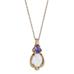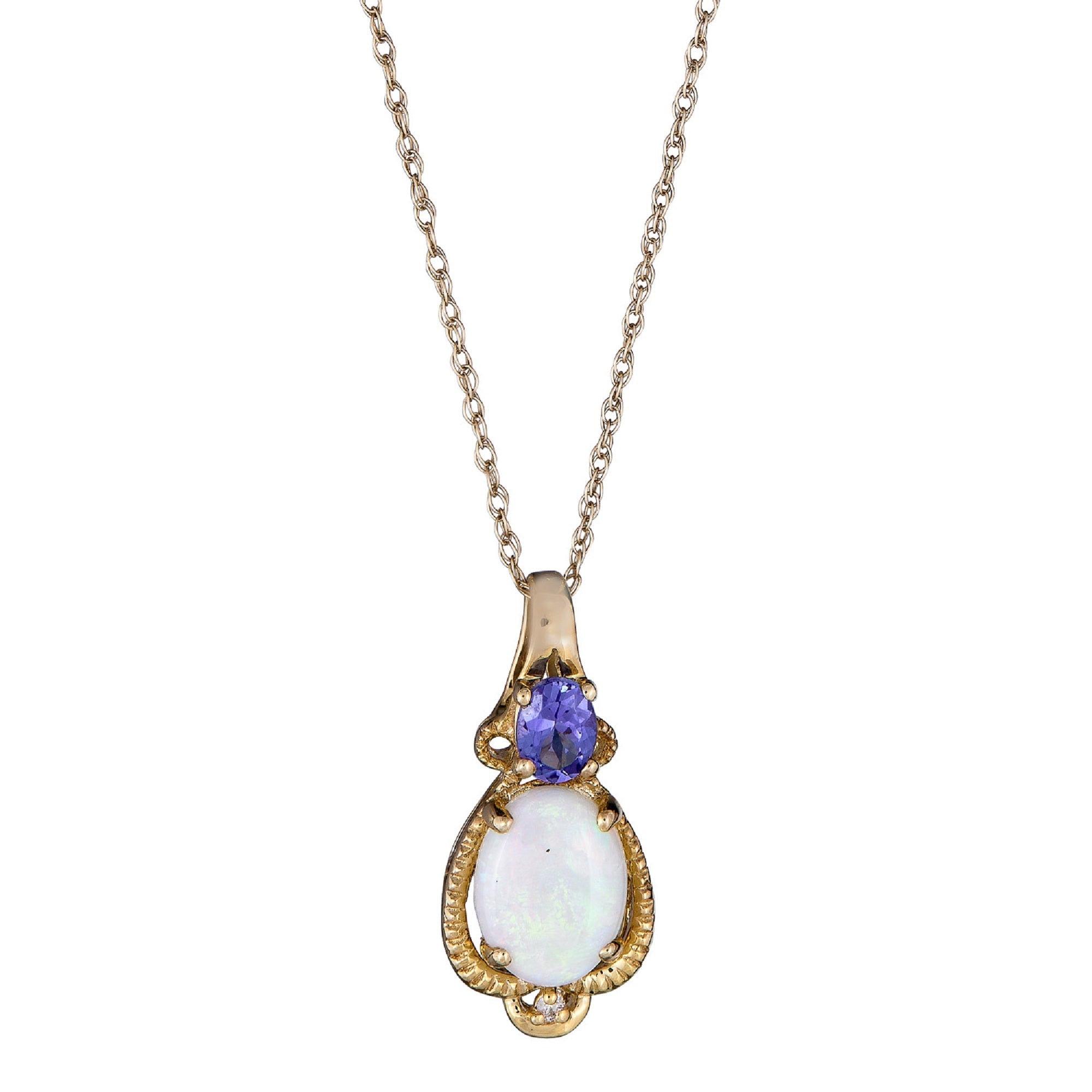 Decorate yourself in elegance with this Pendant is crafted from 10-karat Yellow Gold by The Gin & Grace Pendant. This Pendant is made up of 6X8 mm Oval-cut Prong setting Natural African Opal (1 Pcs) 0.65 Carat and 3X4 mm Oval-cut Prong setting Genuine Tanzanian Tanzanite(1 Pcs) 0.21 Carat and Round-Cut Prong setting Natural White Diamond (1 Pcs) 0.01 Carat. This Pendant is weight 0.87 grams. The gorgeous Pendant hangs from an 18-inch wheat chain. This delicate Pendant is polished to a high finish shine.