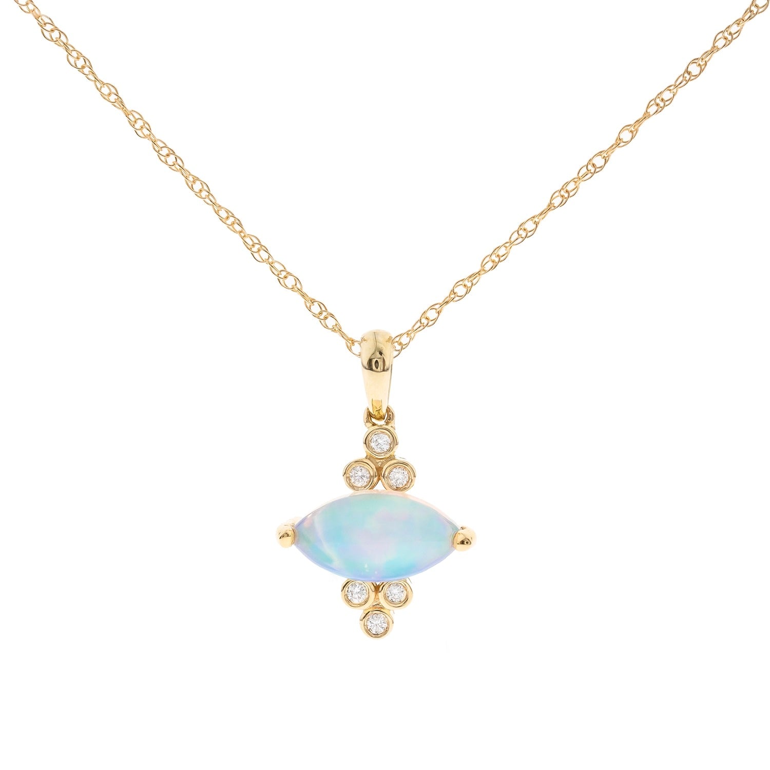 Crafted beautifully, this elegantly displays Natural African Opal gemstones that are accented round diamonds. The Natural African Opal gemstone is Marquise cut and weighs an impressive 0.85 carats. The white diamonds are prong-set to enhance the sparkle of this anniversary, birthday, cocktail, or holiday Pendant. Blue Sapphire: 4 Blue Sapphire 2 Natural Opal Round cut Total Gems Stone weight .52 carats Diamonds: 6 diamonds Round cut G-H color I1-I2 clarity Prong setting Total diamond weight 0.05 carats Metal Information and Details: 10k yellow gold High polish Metal weight 0.88 grams