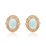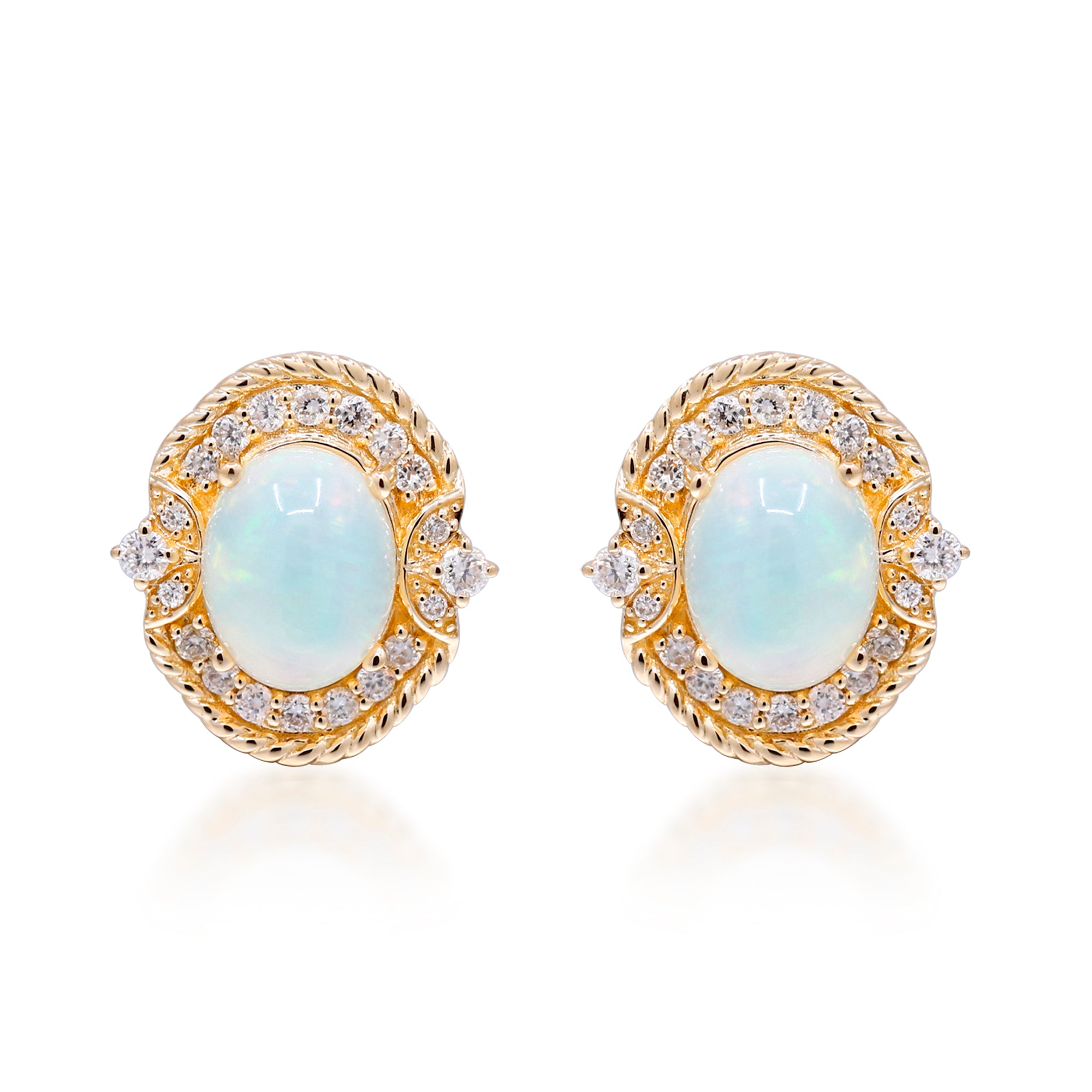 Decorate yourself in elegance with this Earring is crafted from 10-karat Yellow Gold by Gin & Grace. This Earring is made up of 9x7 mm Oval Cab Ethiopian Opal (2 pcs) 2.37 carat and Round-cut White Diamond (40 Pcs) 0.45 Carat. This Earring is weight 4.14 grams. This delicate Earring is polished to a high finish shine.