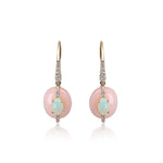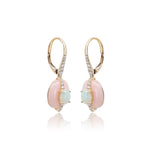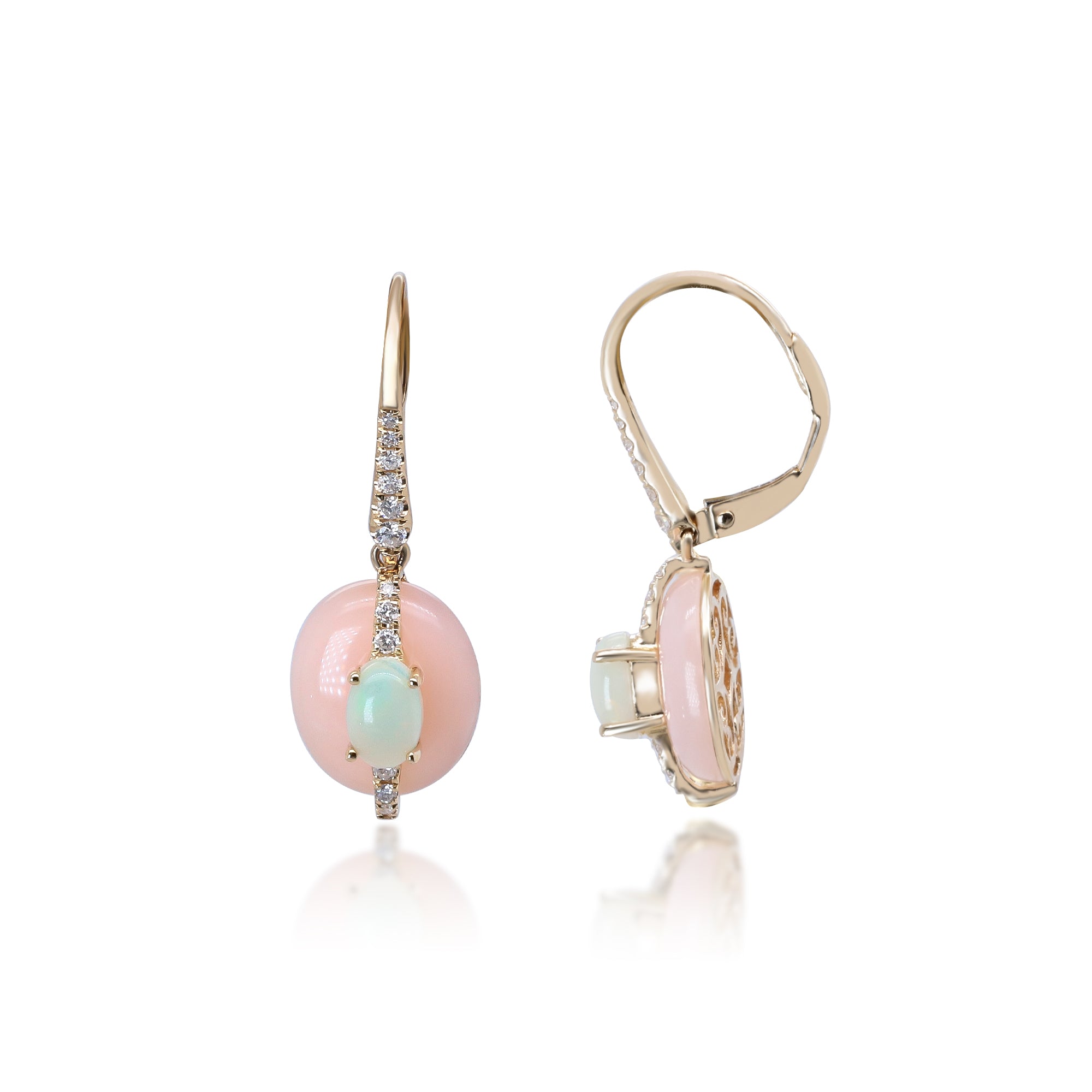 Decorate yourself in elegance with this Earring is crafted from 14-karat Yellow Gold by Gin & Grace. This Earring is made up of Ruby Oval shaped (2 pcs) 1.08 carat, Pink Opal Oval shaped (2 pcs) 4.82 carat Round-cut White Diamond (24 Pcs) 0.20 Carat. This Earring is weight 2.47 grams. This delicate Earring is polished to a high finish shine.