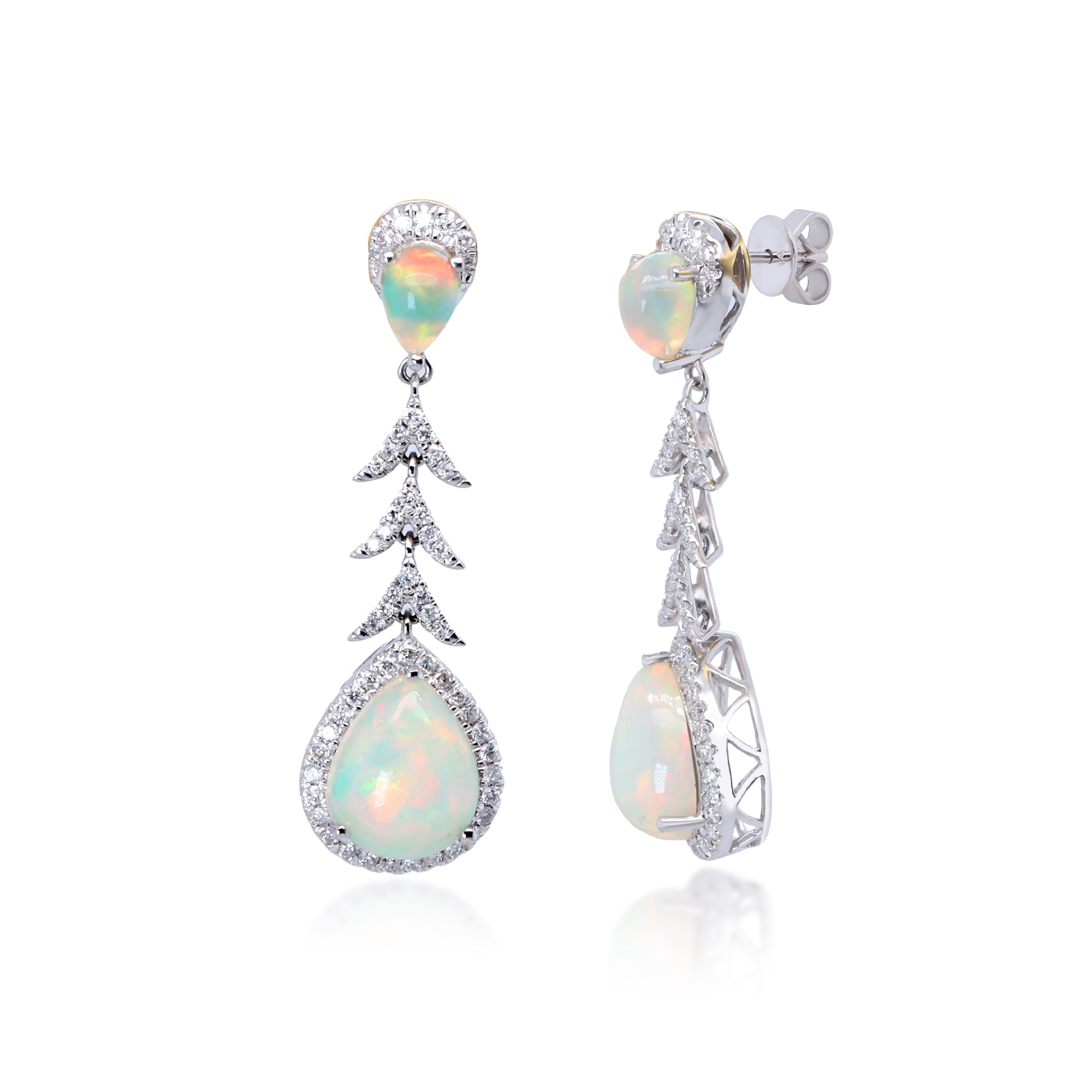 Decorate yourself in elegance with this Earring is crafted from 14-karat White Gold by Gin & Grace. This Earring is made up of 8x10 Pear-cut African Opal (2 pcs) 3.06 carat, 6x4 Pear-cut African Opal (2 pcs) 0.62 carat and Round-cut White Diamond (110 Pcs) 0.49 Carat. This Earring is weight 4.52 grams. This delicate Earring is polished to a high finish shine.