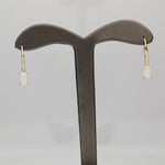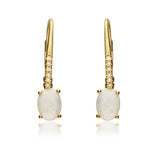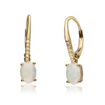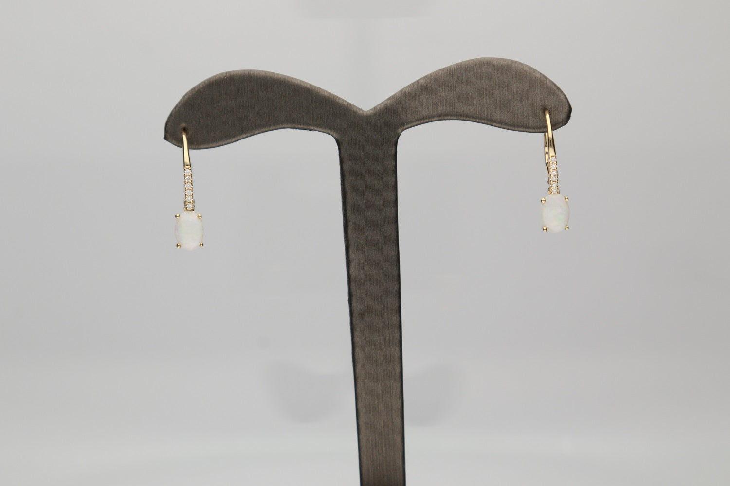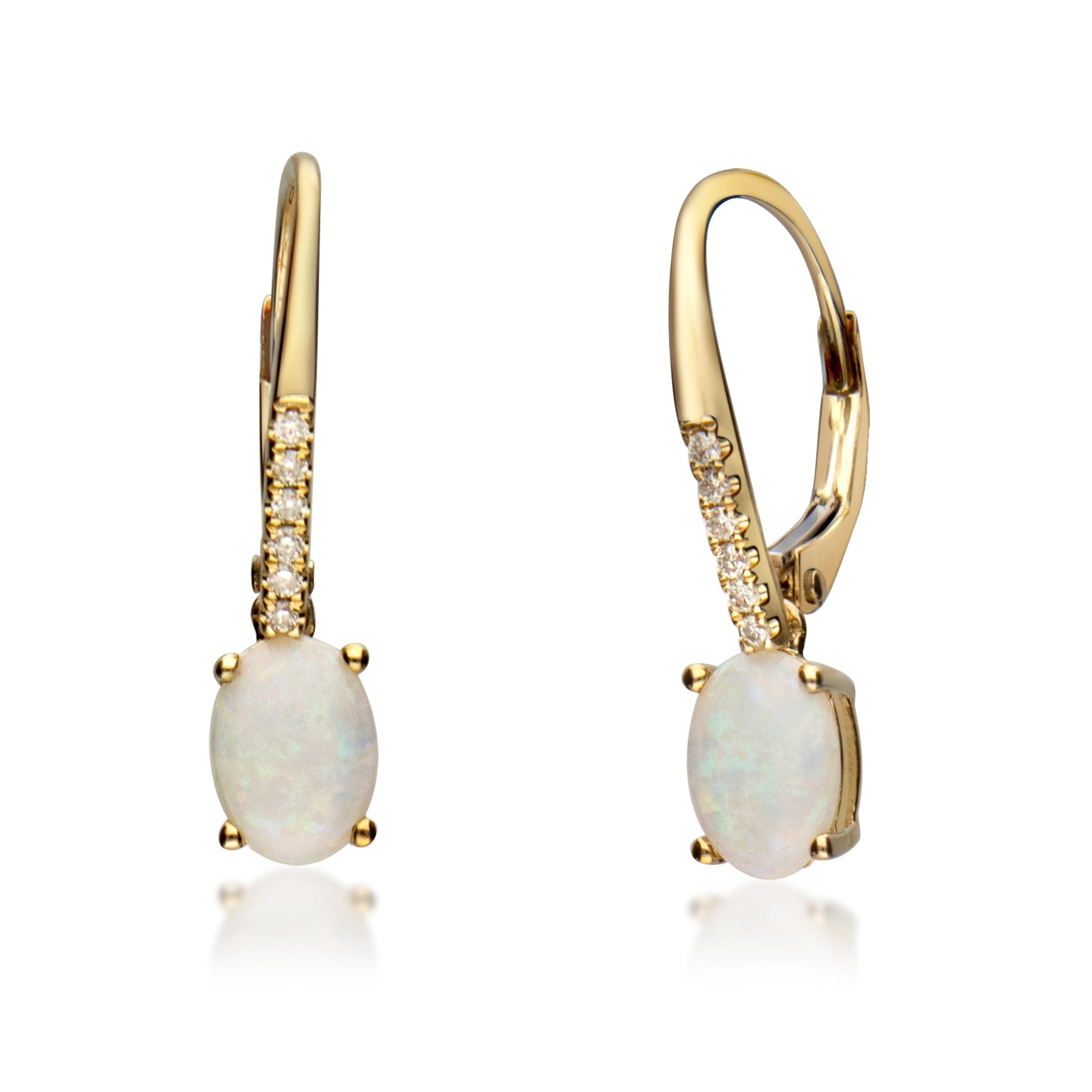Capture the light and complements with these dazzling dangle earrings. Featuring two oval-cut African Opal stones with six shimmering round-cut diamonds, these gorgeous earrings suspend from 14-karat yellow gold hooks. Dangle style 2 prong-set oval-cut Australian opal measure 5 mm wide x 7 mm long 1 3/17 carats total gemstone weight 12 diamonds Round-cut measure 1mm 0.06 carats diamond weight G-H diamond color I1-I2 diamond clarity Prong setting 14k yellow gold High polish finish Lever back clasp Metal weighs 1.35 grams Earring measures 6 mm wide x 17 mm long x 4 mm deep