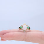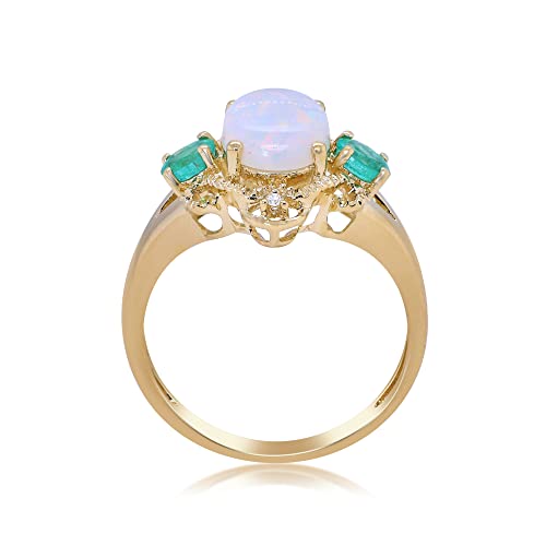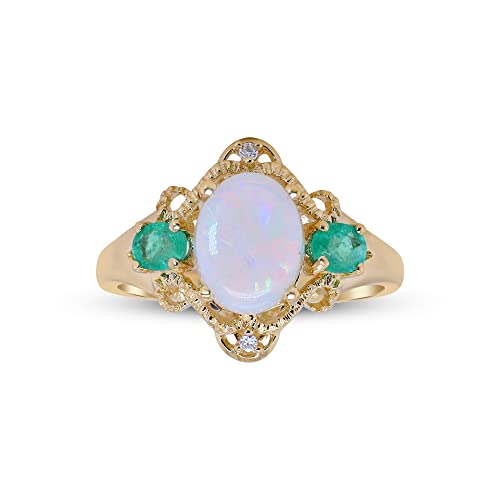 Decorate yourself in luxury with this Gin & Grace ring. The 14k Yellow Gold jewelry boasts 8X10 mm Oval-Cut Prong Setting Natural African Opal stone (3 pcs) 1.27 Carat, and Round-Cut Prong Setting (2 pcs) 0.01 Carat white diamond accent stones for a glimmering design. This ring is weight 2.53 grams. Natural Diamonds with good quality I1-I2. One of a kind Crafted with 14K Yellow Gold, this delicate Ring is polished to a high finish shine.