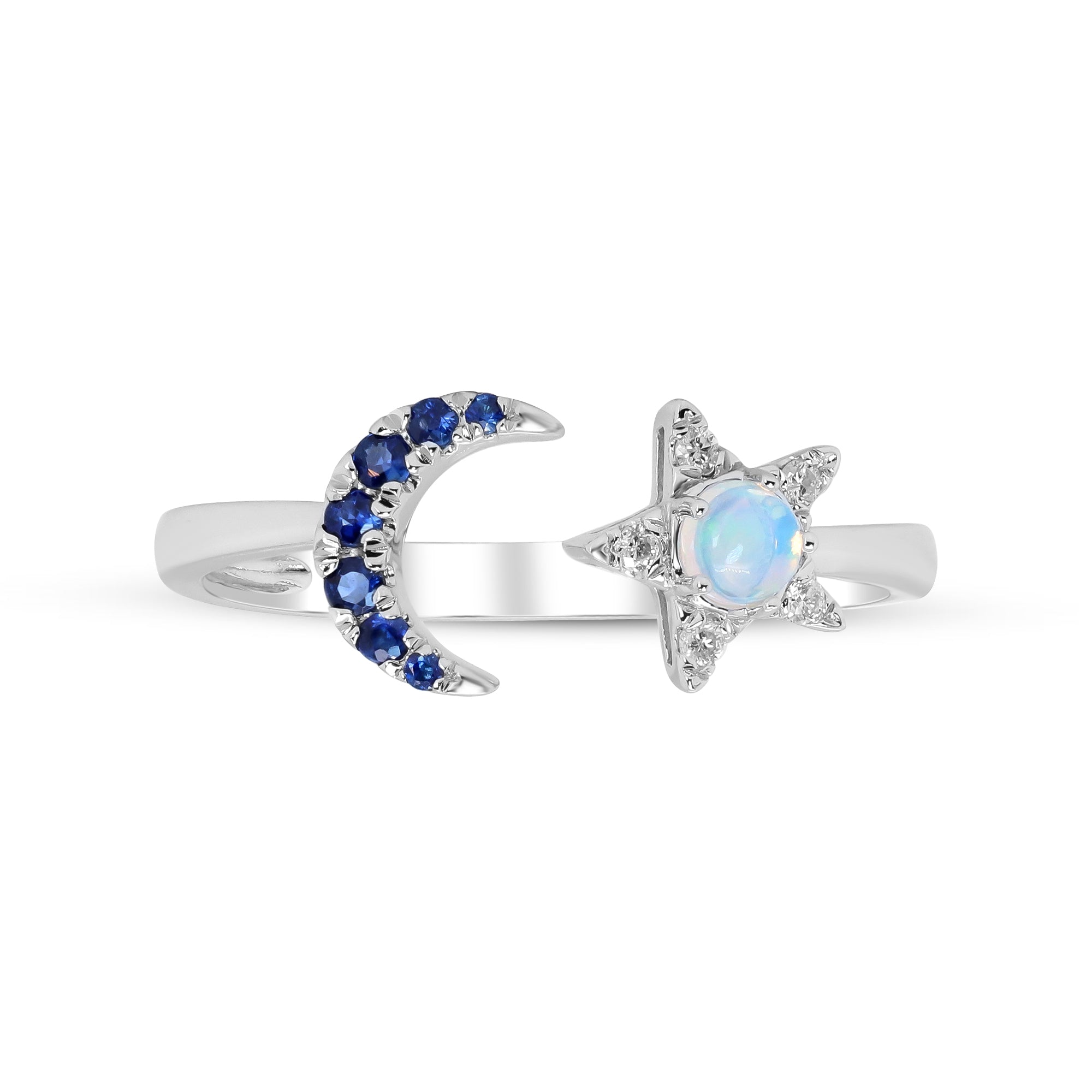 Decorate yourself in elegance with this Ring is crafted from 10K White Gold by Gin & Grace Ring. The jewelry boasts Round-Cut cabochon setting white color Natural Opal (1 pcs) 0.08 Carat and Round-Cut prong setting Diamond (5 pcs) 0.04 Carat and Square-Cut prong setting Blue Sapphire (7 pcs) 0.09 Carat. This Ring is weight 1.44 grams. This delicate Ring is polished to a high finish shine. Simple Stud clasps keep these Ring securely fastened.