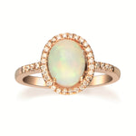 Decorate yourself in elegance with this Ring is crafted from 14-karat Rose Gold by Gin & Grace. This Ring is made up of 3.5 mm Round-cut (1 pcs) 1.24 carat Opal and Round Cut Diamond (36 Pcs) 0.19 Carat. This Ring is weight 2.56 grams. This delicate Ring is polished to a high finish shine.