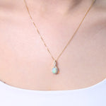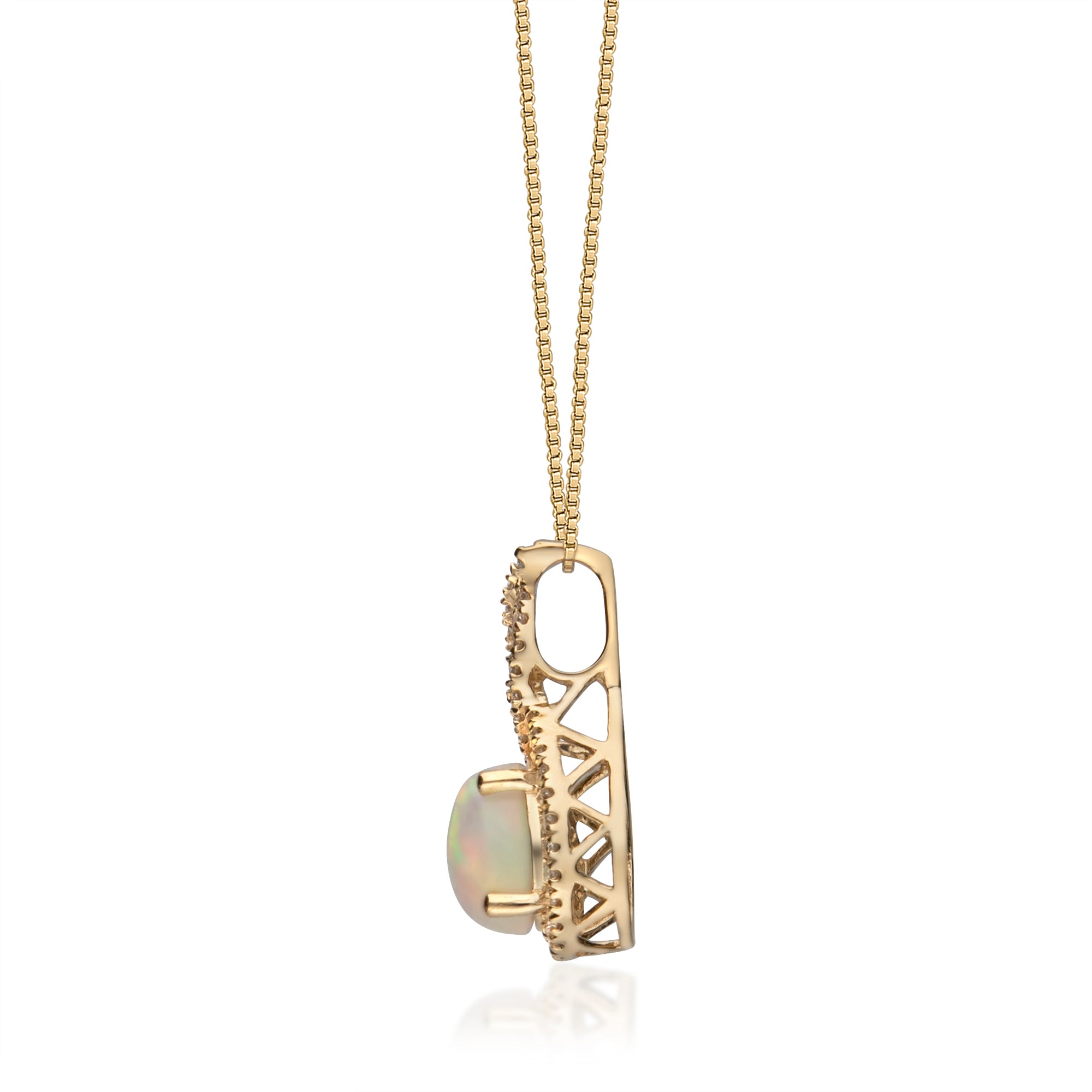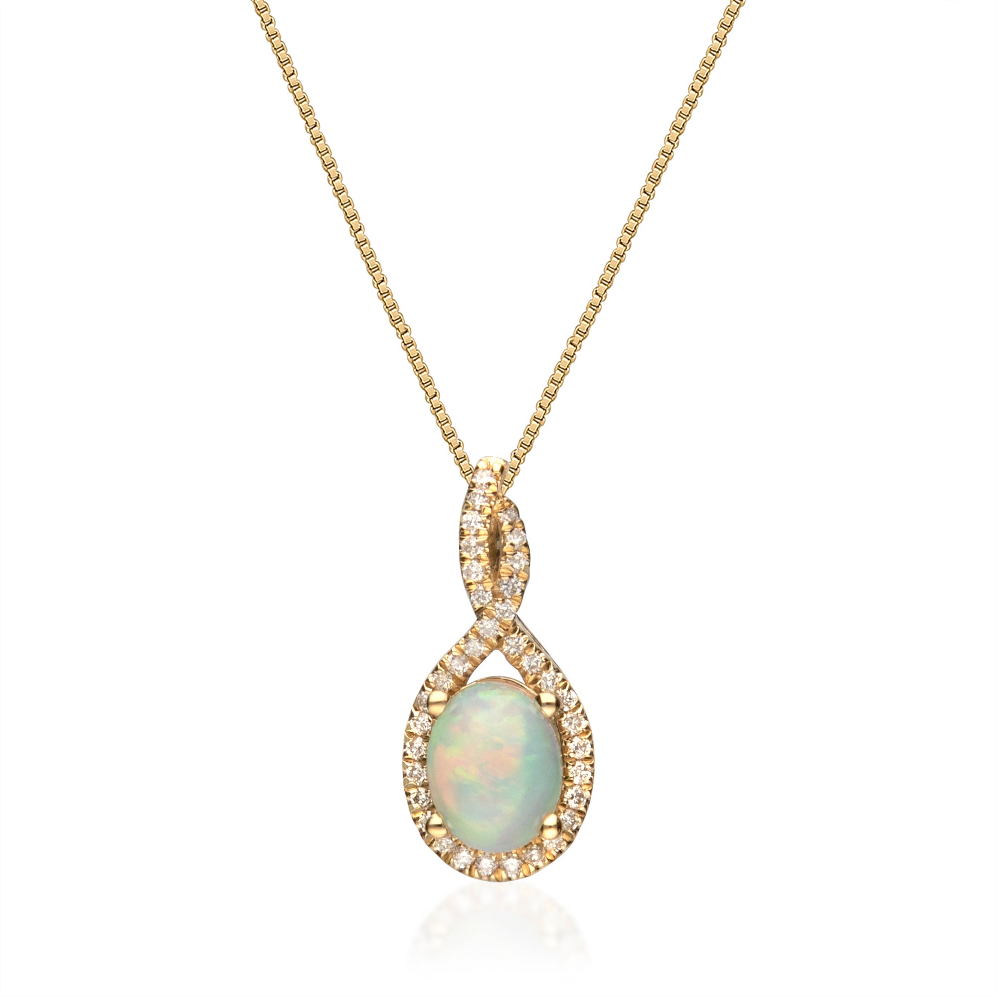 Decorate yourself in elegance with this Pendant is crafted from 10-karat Yellow Gold by The Loop Club Pendant. This Pendant is made up of 6X8 mm oval-Cabochon Prong setting African Opal (1 Pcs) 0.90 Carat and Round-Cut Prong setting White Diamond (36 Pcs) 0.18 Carat. This Pendant is weight 2.46 grams. The gorgeous Pendant hangs from a 18-inch wheat chain. This delicate Pendant is polished to a high finish shine.