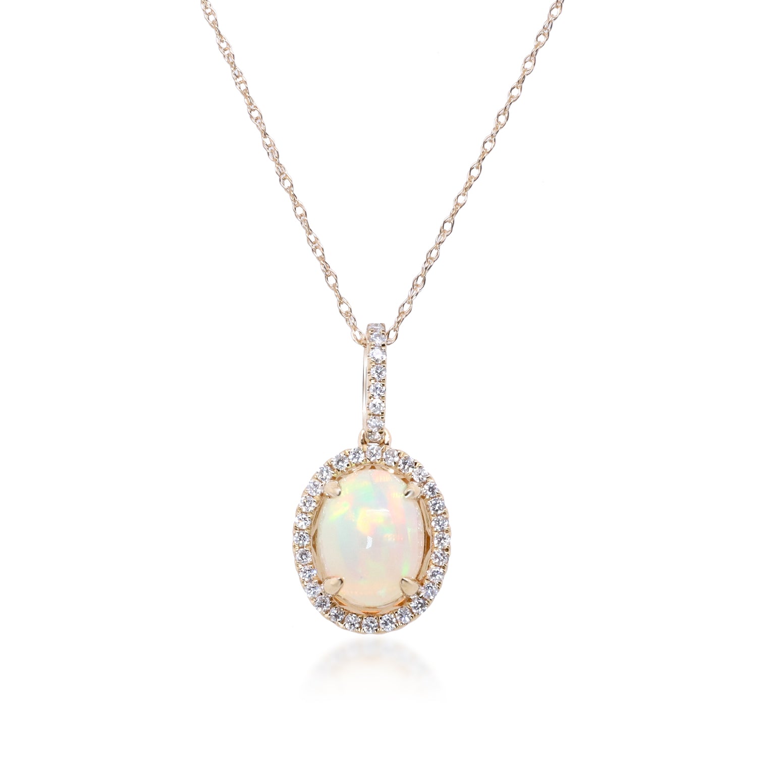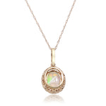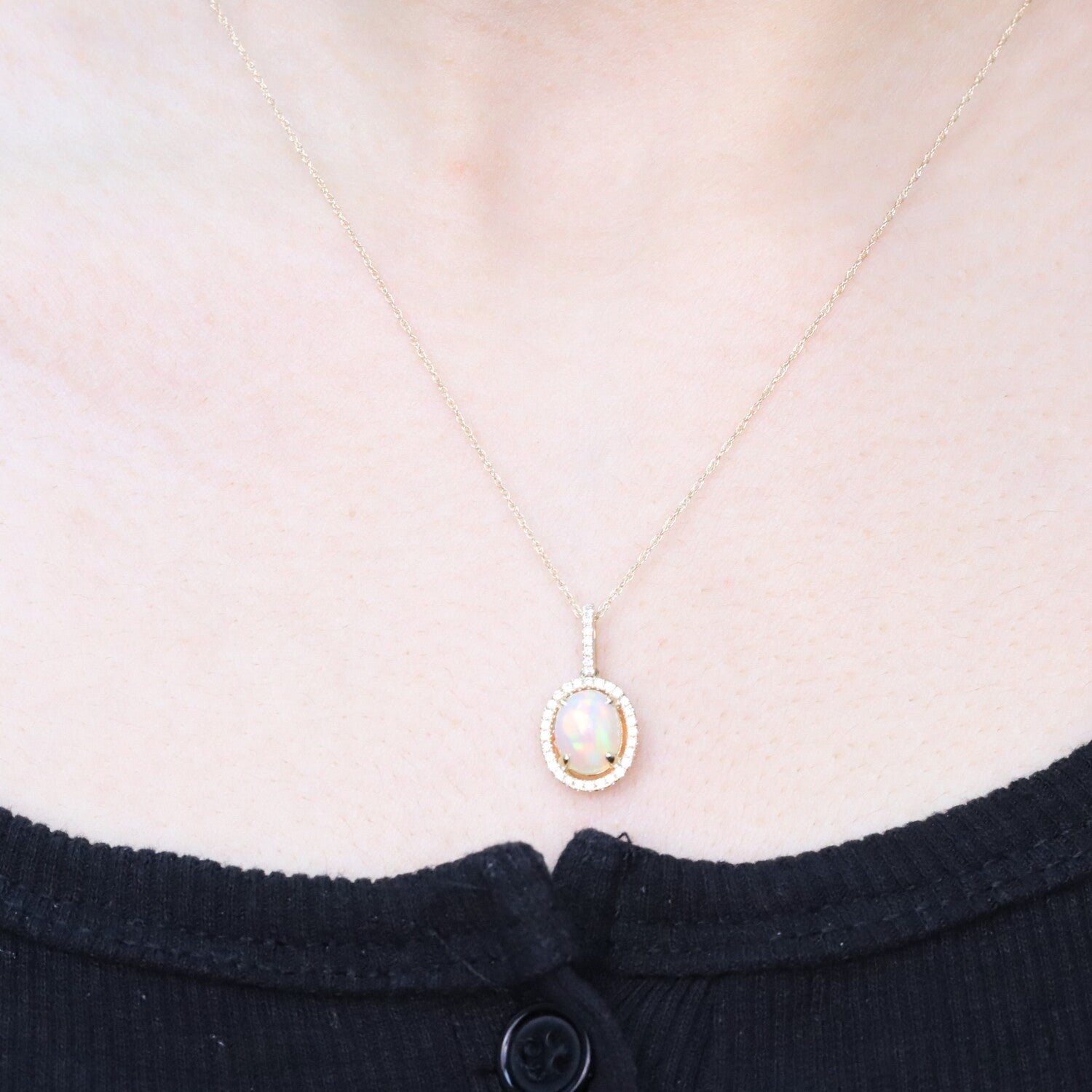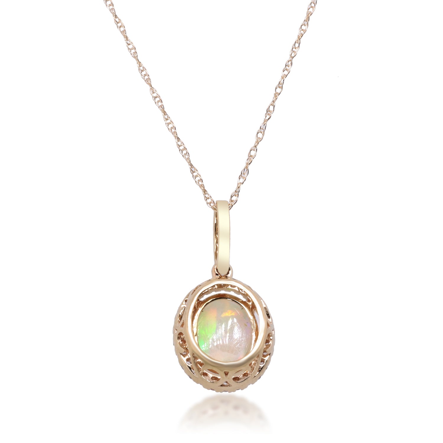 Decorate yourself in elegance with this Pendant is crafted from 14-karat Yellow Gold by Gin & Grace Pendant. This Pendant is made up of Oval-cut Prong setting Ethiopian opal (1 Pcs) 1.27 Carat and Round-Cut Prong setting White Diamond (36 Pcs) 0.17 Carat. This Pendant is weight 1.01 grams. The gorgeous Pendant hangs from an 18-inch wheat chain. This delicate Pendant is polished to a high finish shine.