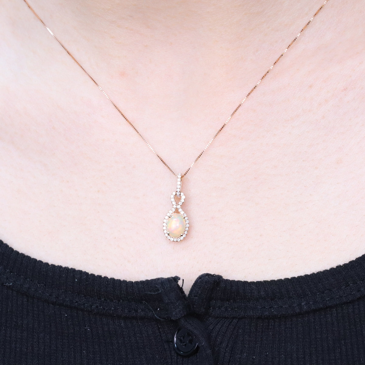 Decorate yourself in elegance with this Pendant crafted from 10-karat rose Gold by Gin & Grace. This Pendant is made up of 6*8 mm African Opal Oval-Cut (1 pcs ) 0.84 and Round-cut Diamond (41 Pcs) 0.20 carat. This Pendant weighs 1.40 grams. This delicate Pendant is polished to a high finish shine.