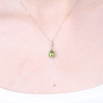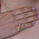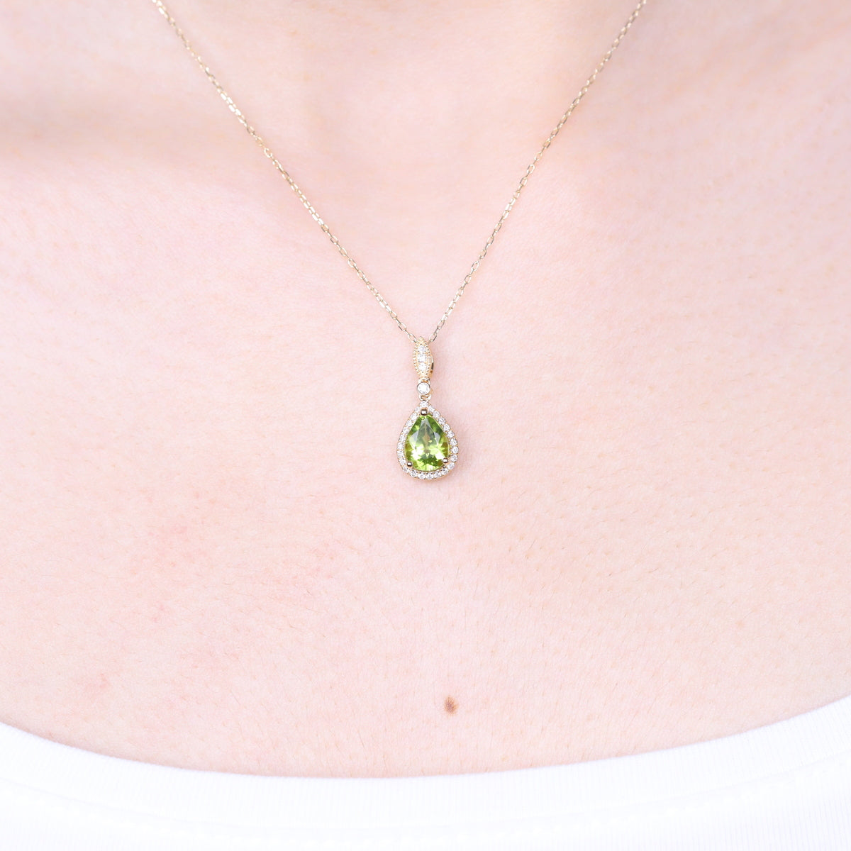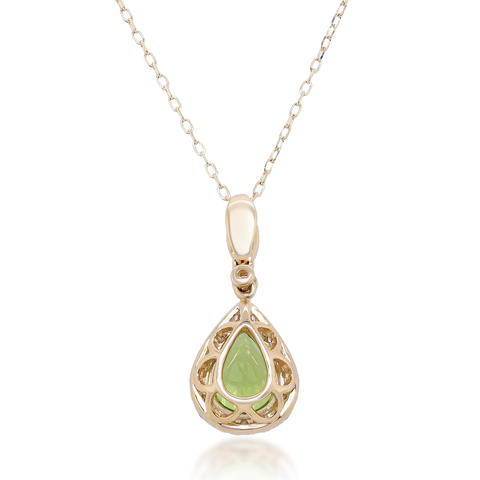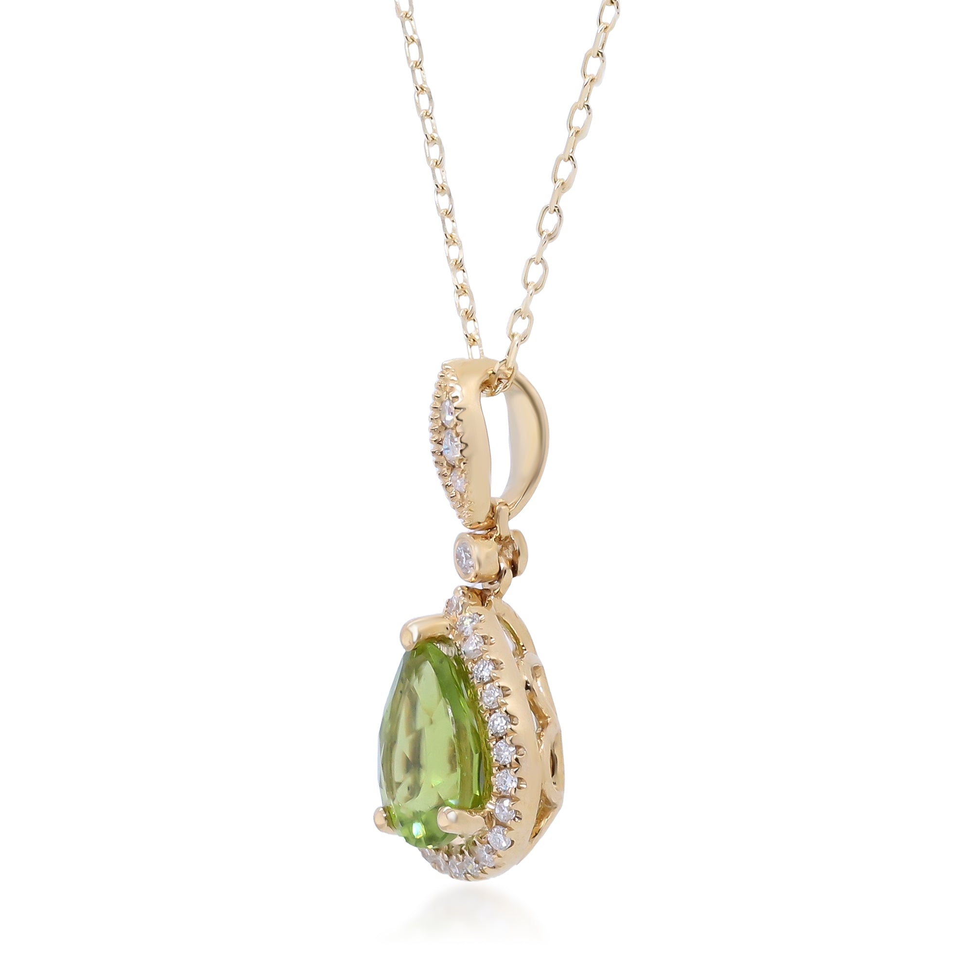 Decorate yourself in elegance with this Pendant is crafted from 14-karat Yellow Gold by Gin & Grace. This Pendant is made up of 6*8 mm Manchurian Peridot pear-cut (1 pcs) 1.29 carat and Round-cut Diamond (28 Pcs) 0.11 carat. This Pendant is weight 1.09 grams and 0.87 grams. This delicate Pendant is polished to a high finish shine.