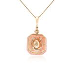 Crafted in radiant 14K yellow gold, this pendant showcases a mesmerizing 1.39-carat Ethiopian opal at its center, known for its vibrant color play. Surrounding it is a halo of soft pink opals totaling 2.08 carats, adding a warm, rosy touch to the piece. A single diamond accent at the top completes the design with a touch of sparkle, making this pendant a beautiful statement of elegance and refinement. Perfect for adding timeless charm to any jewelry collection.