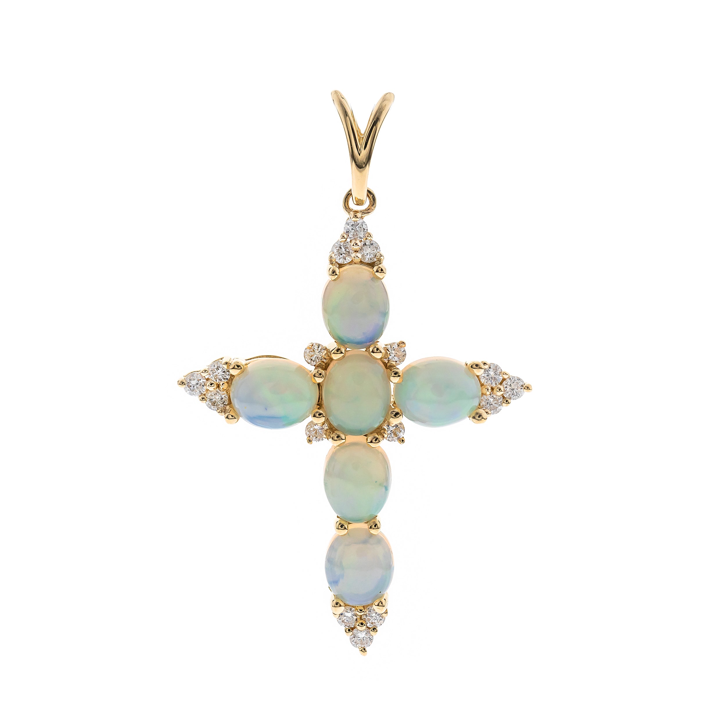 Decorate yourself in elegance with this Pendant crafted from 14-karat yellow Gold by Gin & Grace. This Pendant is made up of African Opal oval-cut (6 pcs ) 1.41 and Round-cut White Diamond (16 Pcs) 0.17 carat. This Pendant weighs 1.39 grams. This delicate Pendant is polished to a high finish shine.