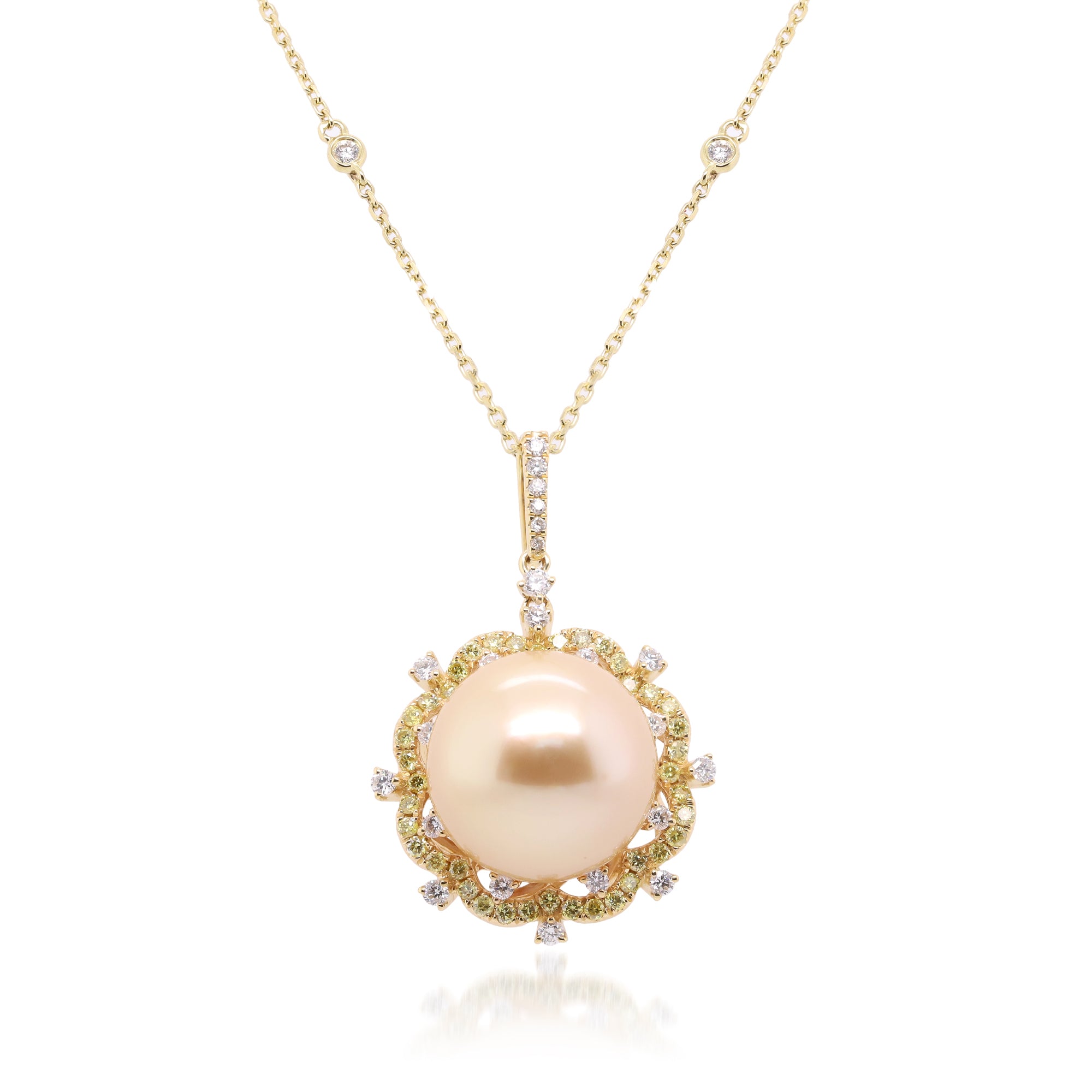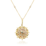 Decorate yourself in elegance with this Pendant crafted from 18-karat Yellow Gold by Gin & Grace. This Pendant is made up of 12-16 Round South Sea Pearl (1 pcs) 15.36 carat, Round-cut White Diamond (65 Pcs) 0.60 Carat. These Pendant weighs 5.30 grams. This delicate Pendant is polished to a high finish shine.