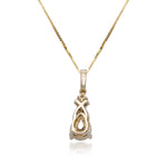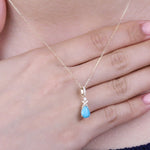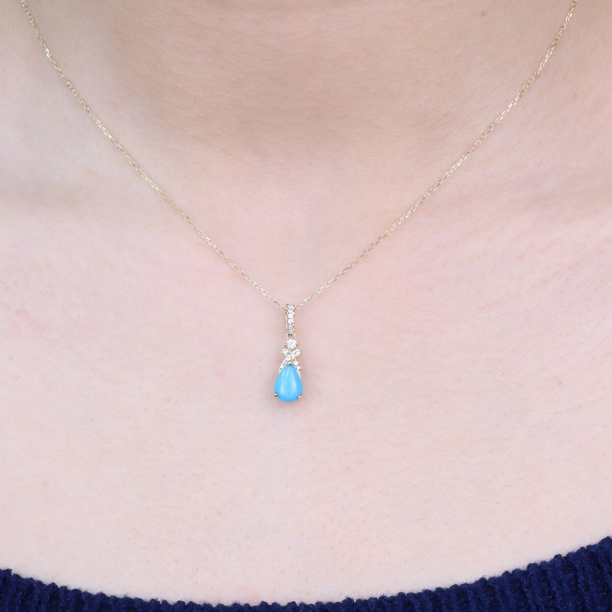 Decorate yourself in elegance with this Pendant is crafted from 14-karat Yellow Gold by Gin & Grace Pendant. This Pendant is made up of 8x6 mm Pear-Cab Cabochon setting Natural Arizona Turquoise (1 Pcs) 1.22 Carat and Round-Cut Prong setting Natural White Diamond (17 Pcs) 0.12 Carat. This Pendant is weight 1.77 grams. The gorgeous Pendant hangs from a 18-inch wheat chain. This delicate Pendant is polished to a high finish shine.