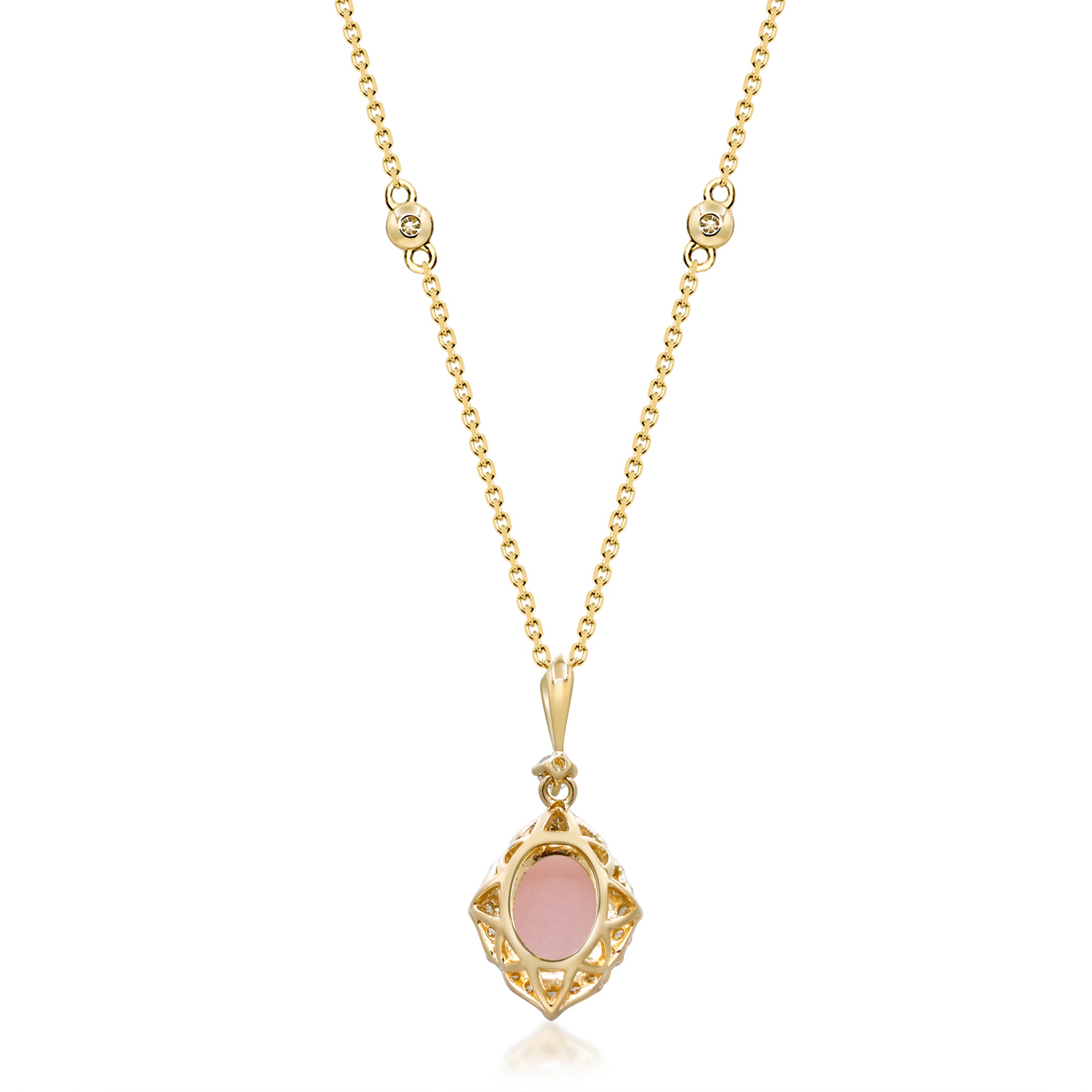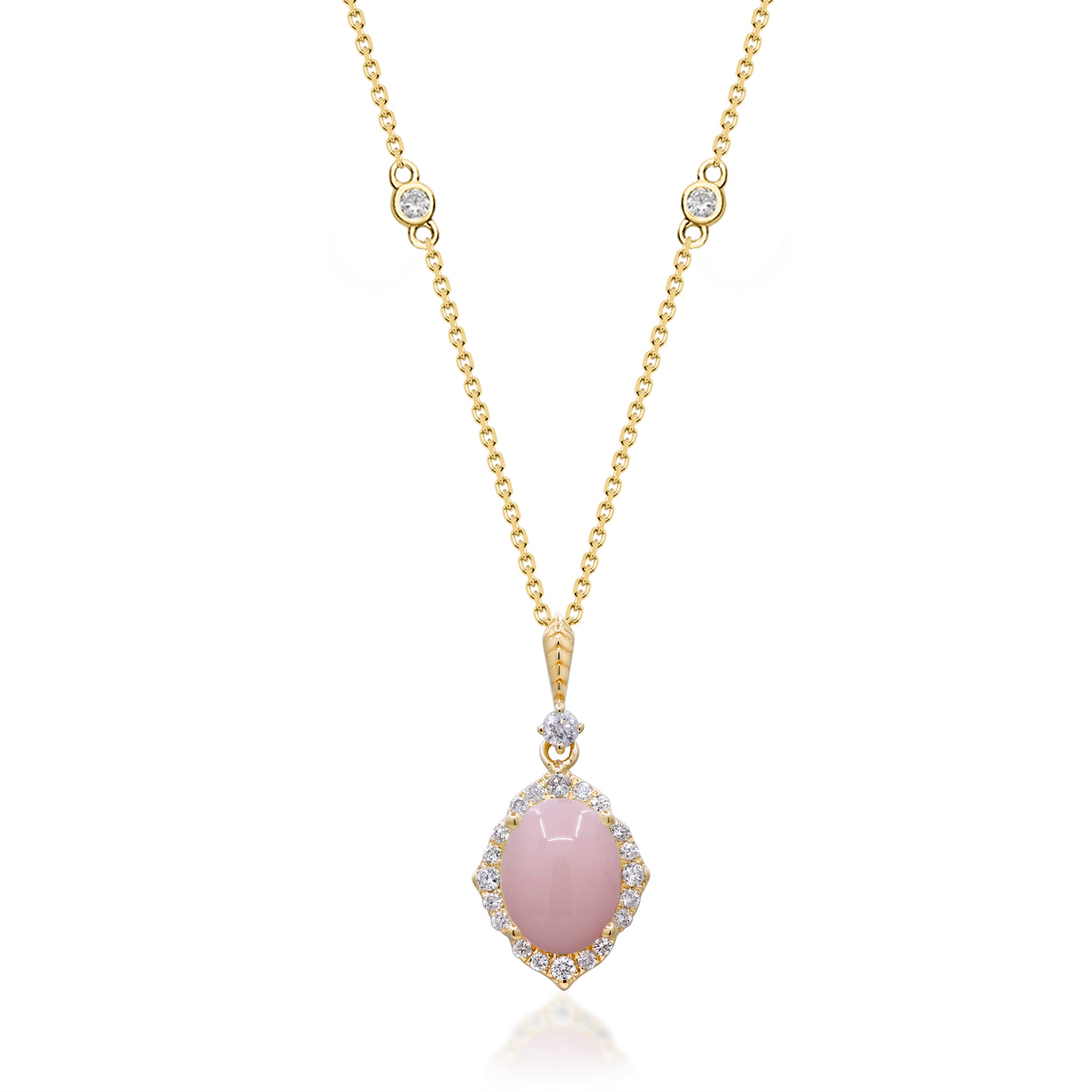 Decorate yourself in elegance with this Pendant is crafted from 14-karat Yellow Gold by Gin & Grace Pendant. This Pendant is made up of Peruvian Pink Opal Oval-cut (1 Pcs) 1.78 Carat. Round-cut White Diamond (19 Pcs) 0.23 Carat. This Pendant is weight 2.76 grams. The gorgeous Pendant hangs from an 18-inch wheat chain. This delicate Pendant is polished to a high finish shine.