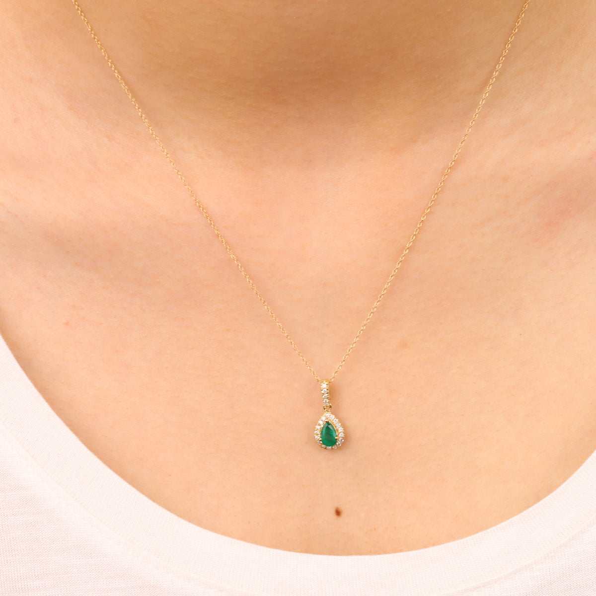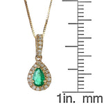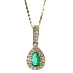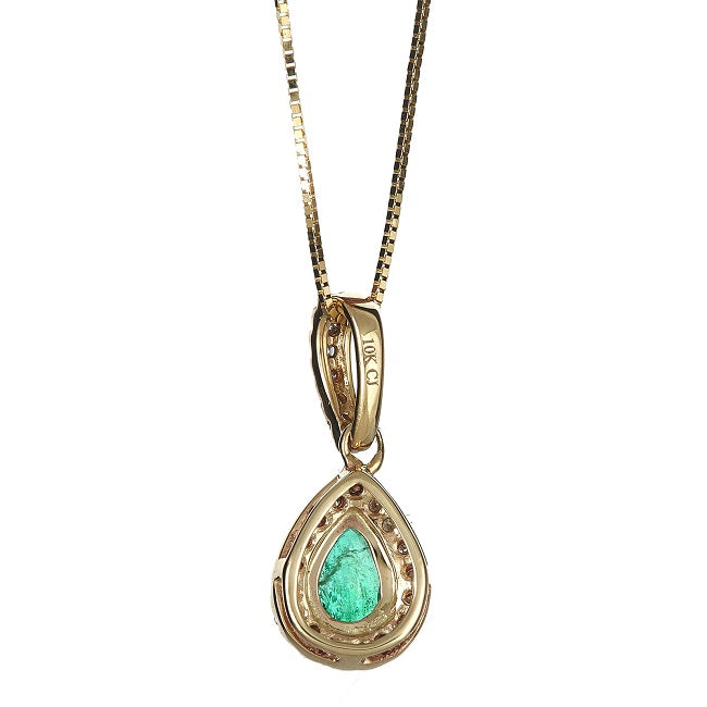 This stunning Pendant is constructed of 10-karat yellow gold and holds a vibrant Zambian Emerald surrounded by a halo of diamonds with a 0.125 carat total weight. The pendant suspends from an 18-inch box chain with a spring ring clasp. Style: Pendant Gemstone colors: Green Gemstone shapes: Pear One prong-set pear-cut Gin & Grace Natural Zambian Emerald measures 4 mm wide x 6 mm long Gemstone weight: 0.36 carat Diamonds: 23 Diamond cut: Round Diamond measurement: 1 mm Diamond weight: 0.125 carat Color: G-H Clarity: I1-I2 Setting: Prong Metal: 10k yellow gold Finish: High polish Chain: Box Chain length: 18 inches Clasp: Spring ring Metal weight: 1.0 gram Pendant dimensions: 7 mm wide x 16 mm long x 4 mm deep Pendant dimensions: 1 mm wide x 18 inches long