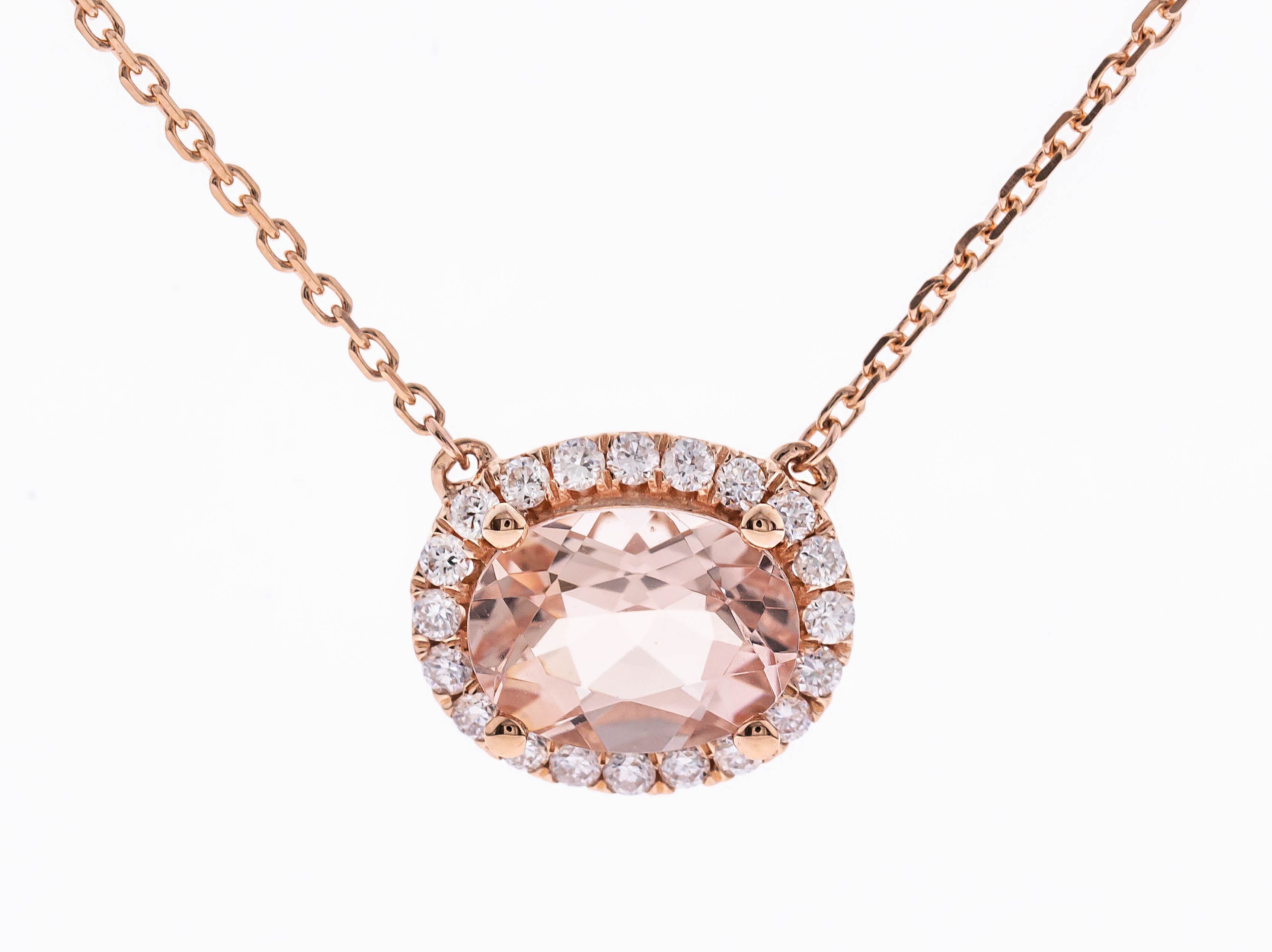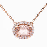 Decorate yourself in elegance with this Pendant is crafted from 10-karat Rose Gold by Gin & Grace Pendant. This Pendant is made up of 6X8 Oval-Cut Prong setting Madagascar Morganite (1 Pcs) 0.98 Carat and Round-Cut Prong setting White Diamond (22 Pcs) 0.21 Carat. This Pendant is weight 2.30 grams. The gorgeous Pendant hangs from a 18-inch wheat chain. This delicate Pendant is polished to a high finish shine.