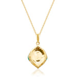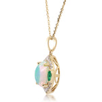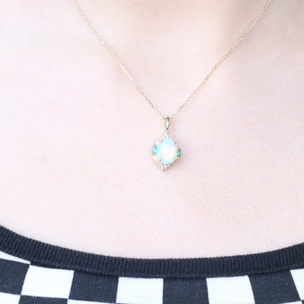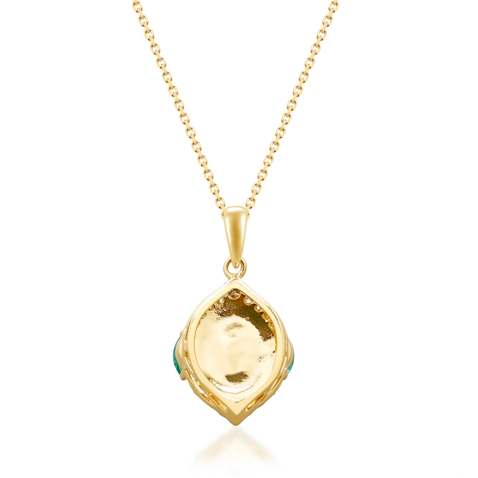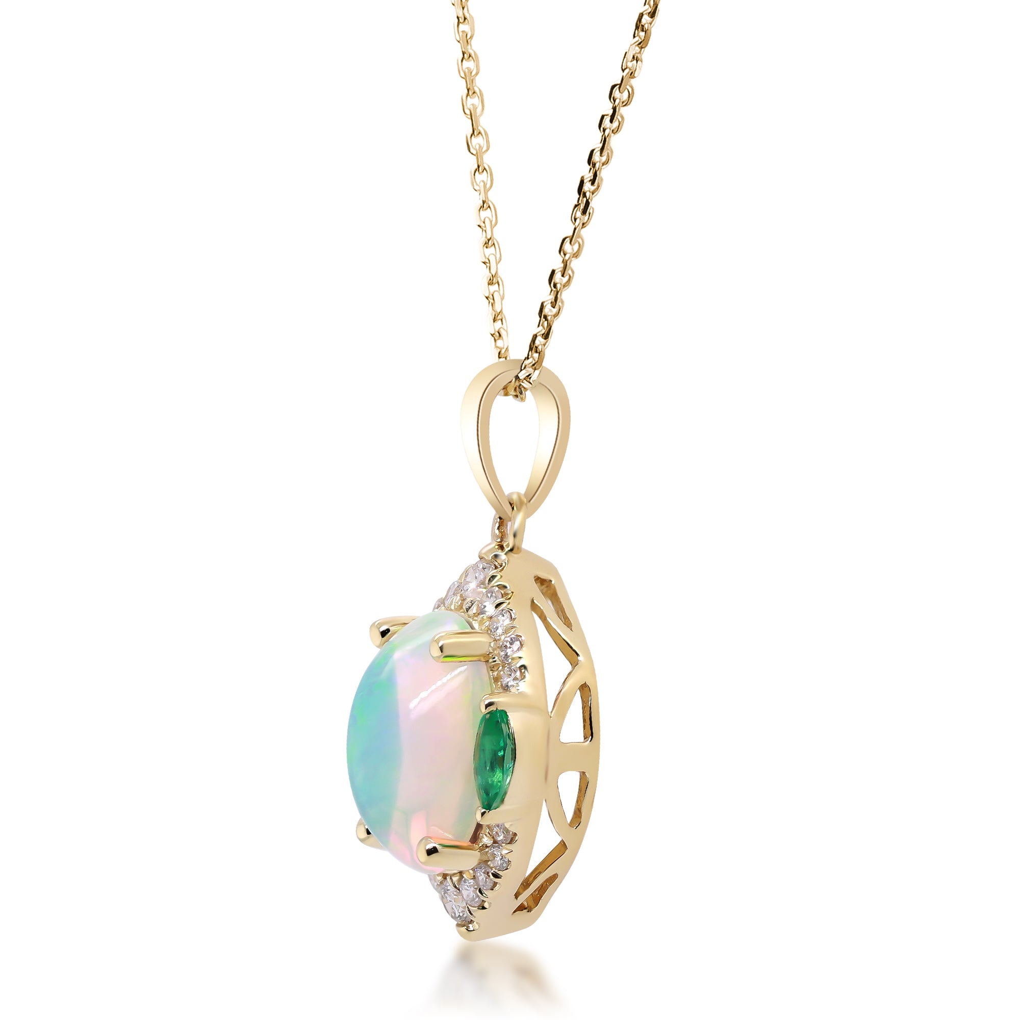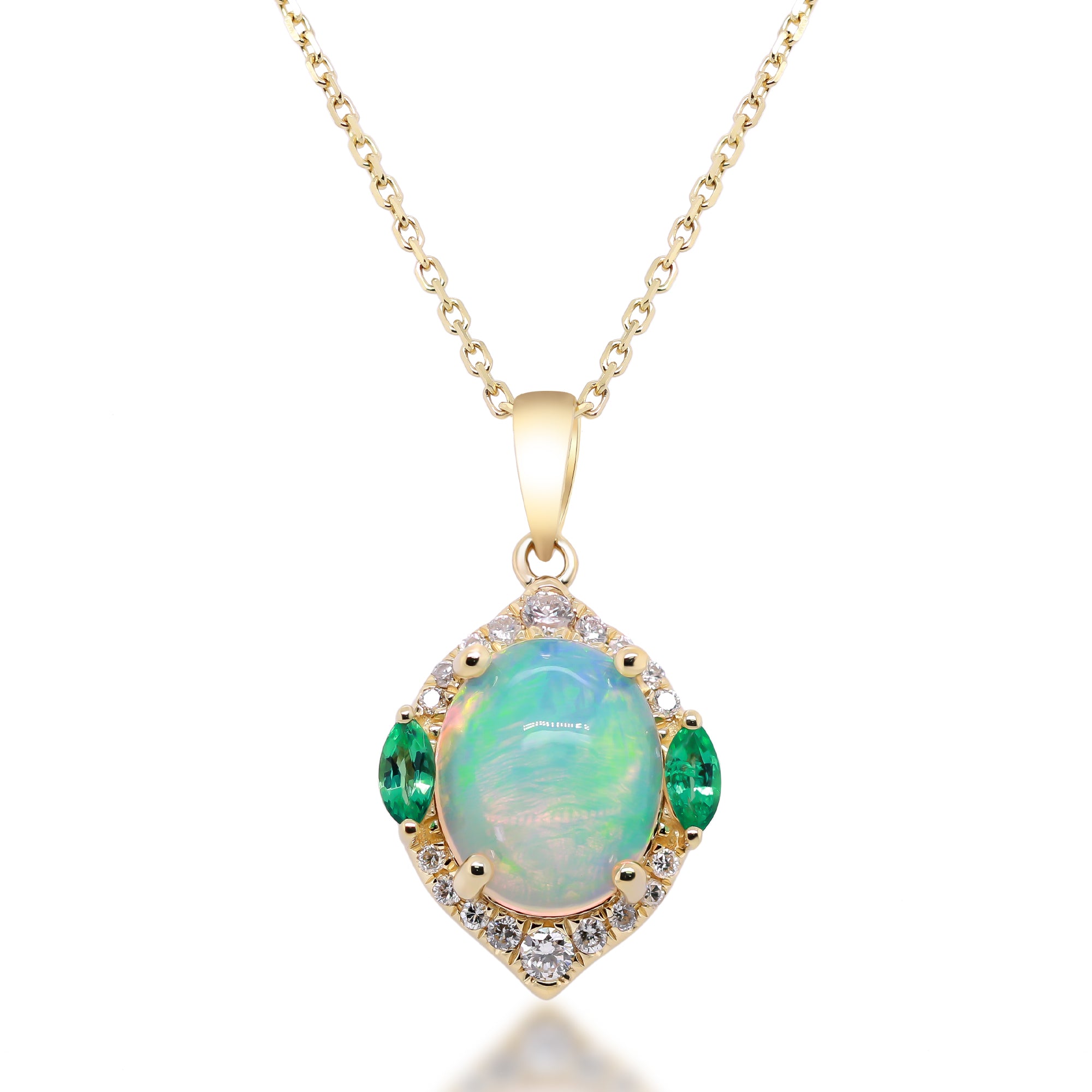 Decorate yourself in elegance with this Pendant is crafted from 10-karat Yellow Gold by Gin & Grace. This Pendant is made up of 8x10 mm Oval Cat African Opal (1 pcs) 1.69 carat, 2x4 mm Marquise cut Emerald (2 pcs) 0.14 carat, Round-cut White Diamond (18 Pcs) 0.15 Carat. This Pendant is weight 1.53 grams. This delicate Pendant is polished to a high finish shine.