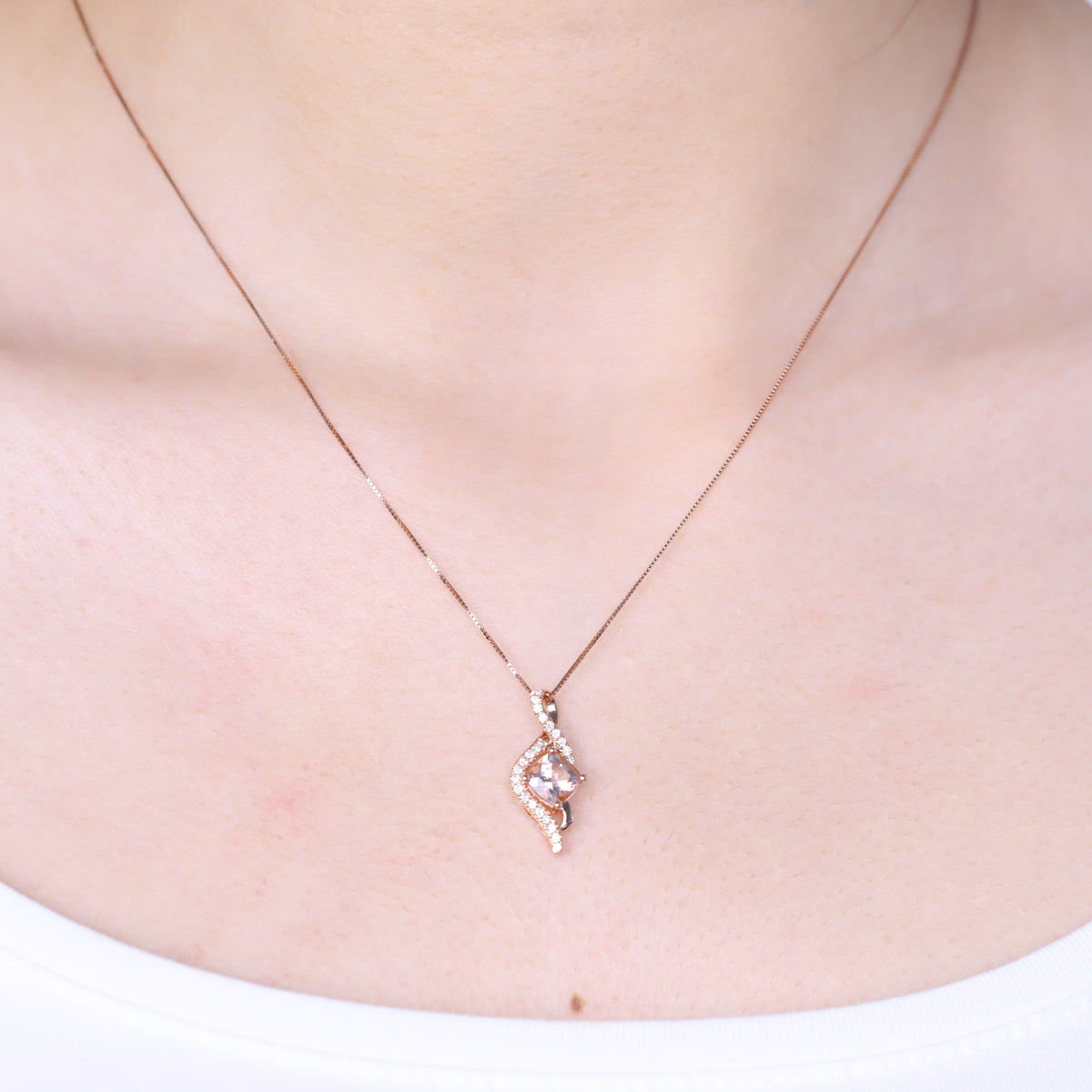 Decorate yourself in elegance with this Pendant is crafted from 14-karat Rose Gold by Gin & Grace. This Pendant is made up of 6.0 mm Cushion-Cut Madagascar Morganite (1 pcs) 0.84 carat and Round-cut White Diamond (23 Pcs) 0.16 Carat. This Pendant is weight 1.02 grams. This delicate Pendant is polished to a high finish shine.