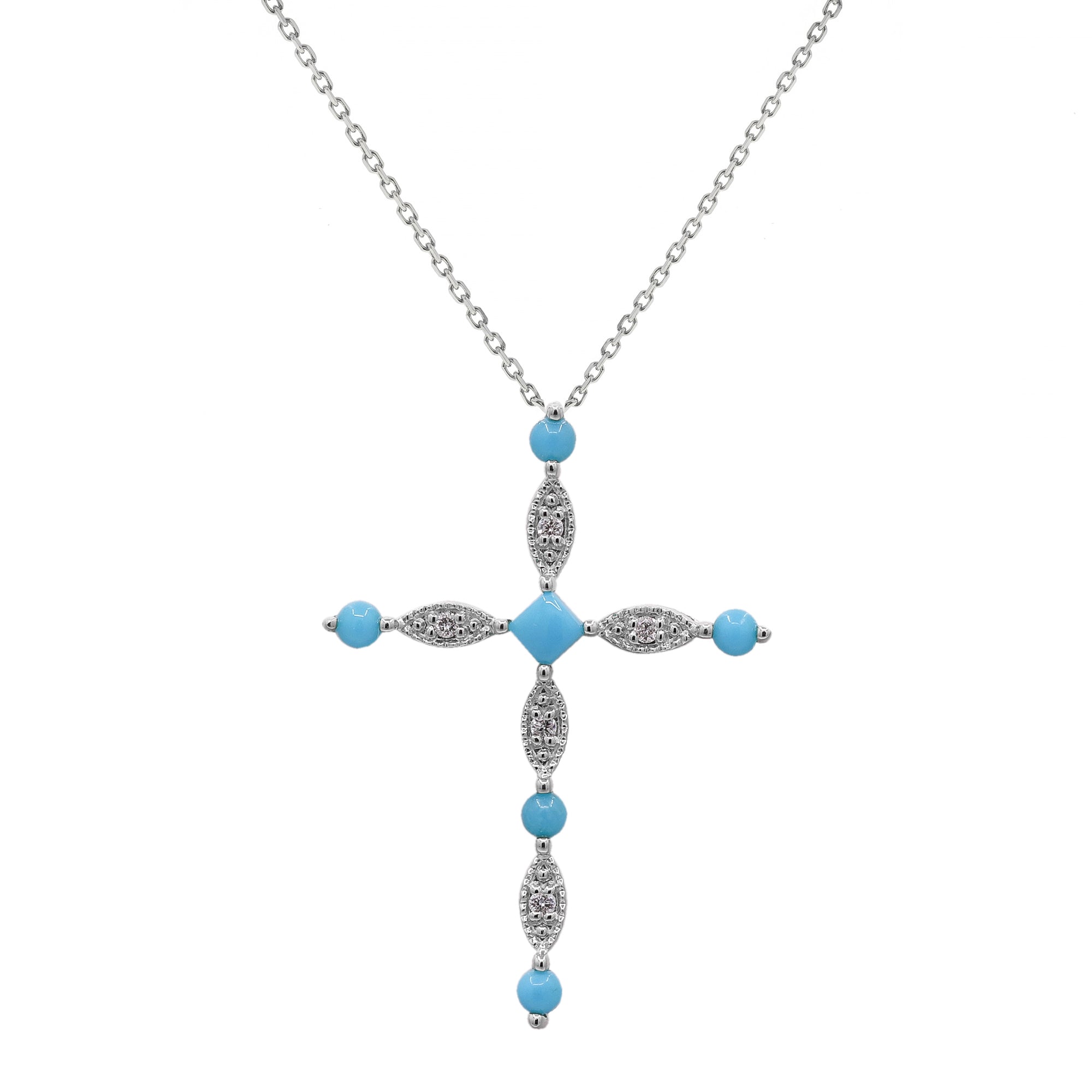 Decorate yourself in elegance with this Pendant is crafted from 10-karat White Gold by Gin & Grace. This Pendant is made up of Round-cut Arizona Turquoise (5 Pcs) 0.21 carat, 2.5 Round-cut Arizona Turquoise (1 Pcs) 0.10 carat and Round-cut White Diamond (5 Pcs) 0.04 carat. This Pendant weight is 1.94 grams. This delicate Pendant is polished to a high finish shine.