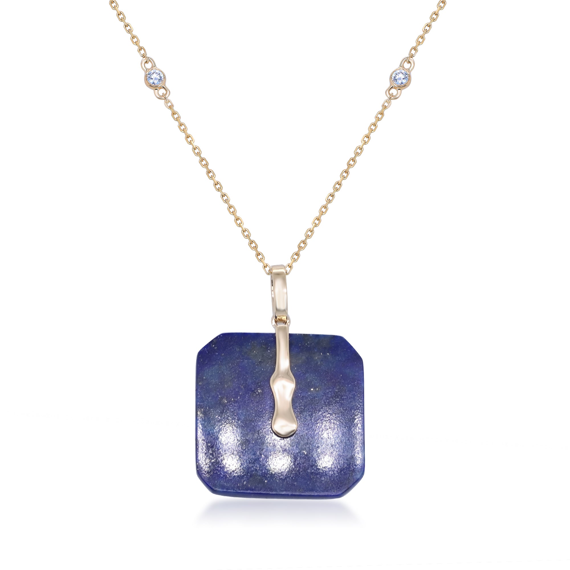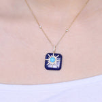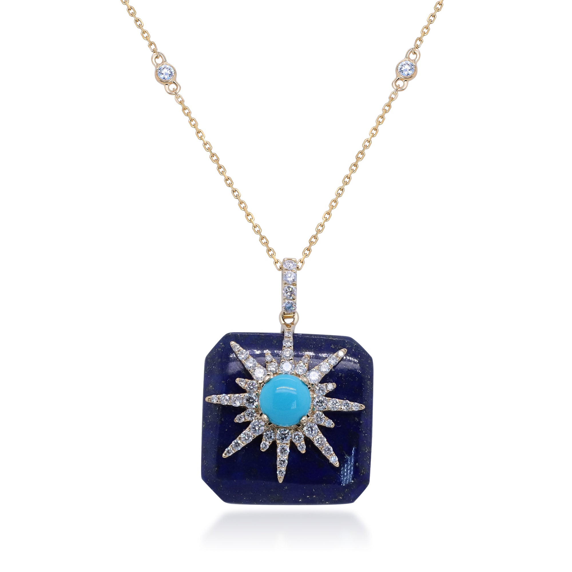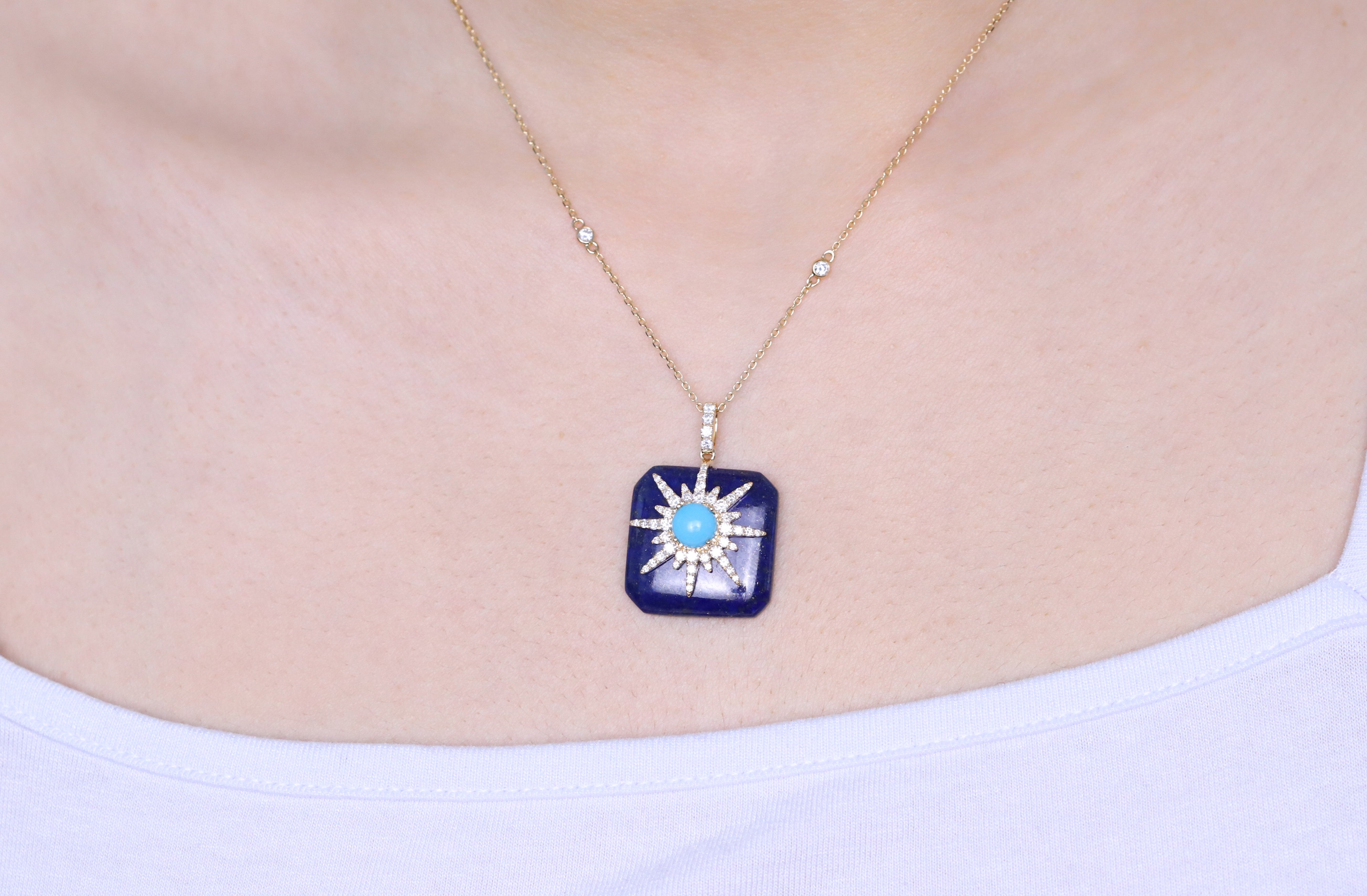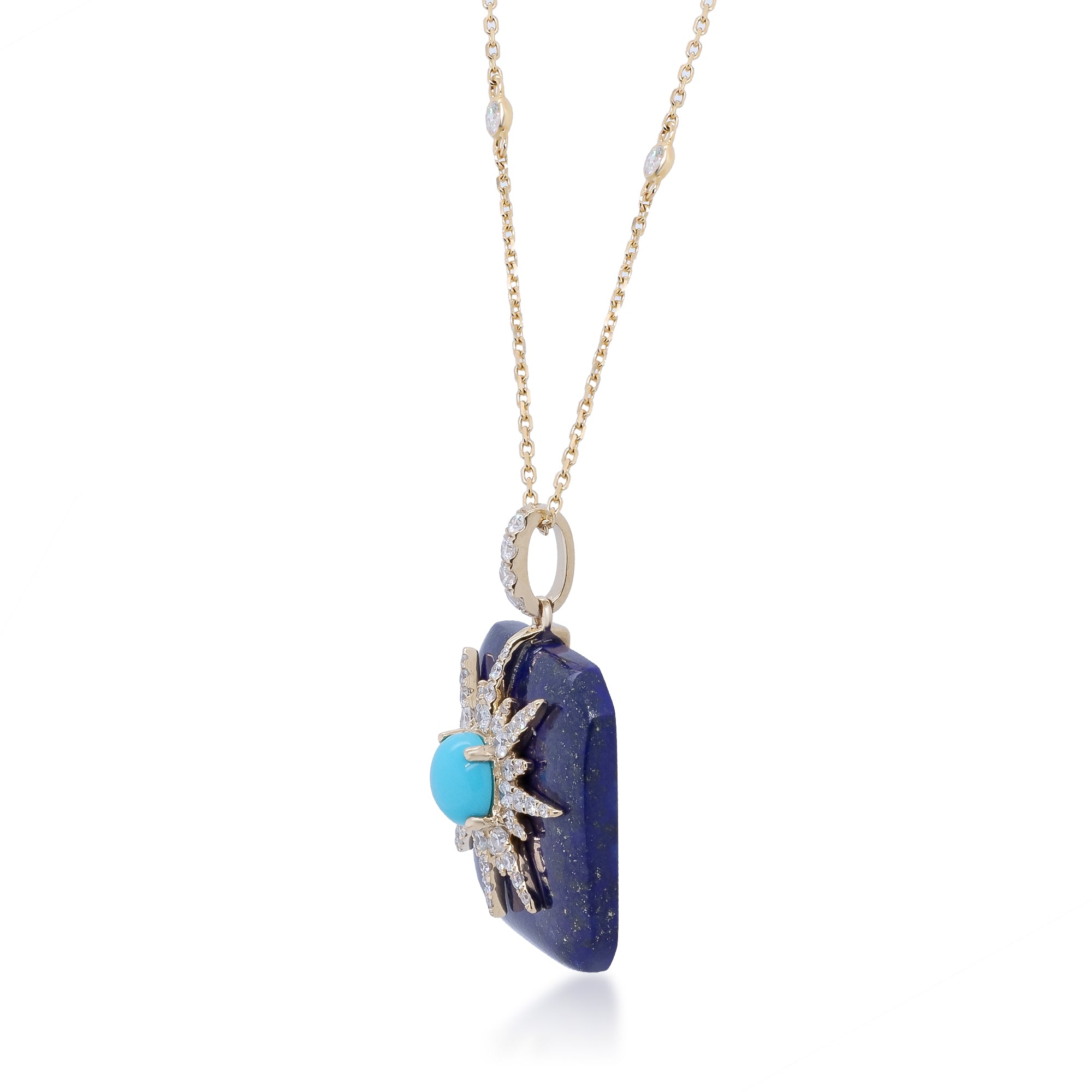 Decorate yourself in elegance with this Pendant is crafted from 14-karat Yellow Gold by Gin & Grace Pendant. This Pendant is made up of 6.0MM Round-Cut Prong setting Arizona Turquoise (2 Pcs) 20.41 Carat and Round-Cut Prong setting White Diamond (54 Pcs) 0.62 Carat. This Pendant is weight 3.62 grams. The gorgeous Pendant hangs from a 18-inch wheat chain. This delicate Pendant is polished to a high finish shine.