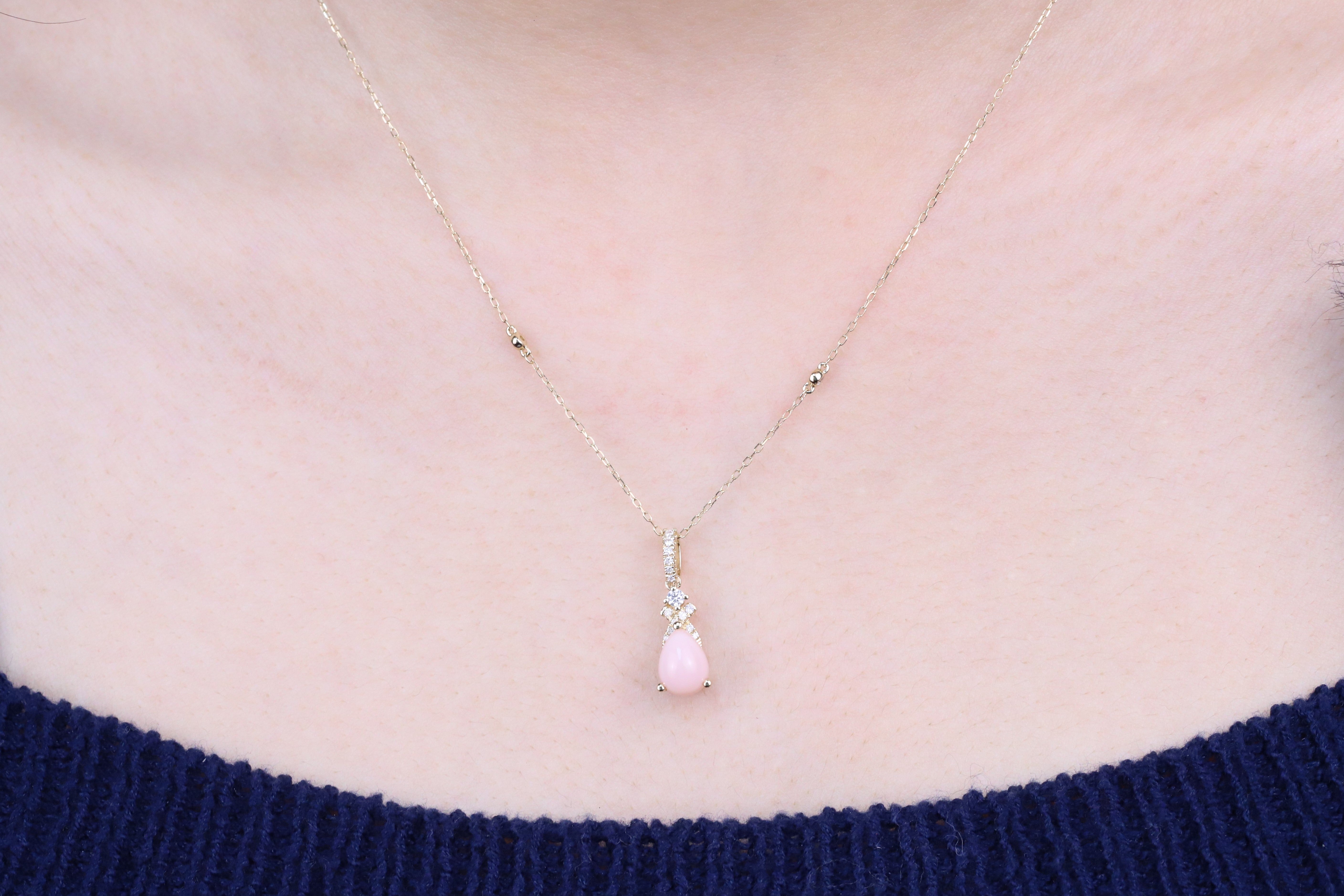 Decorate yourself in elegance with this Pendant is crafted from 14-karat Yellow Gold by Gin & Grace Pendant. This Pendant is made up of Peruvian Pink Opal Pear-cut (1 Pcs) 1.13 Carat and Round cut White Diamond (17 Pcs) 0.13 Carat. This Pendant is weight 1.97 grams. The gorgeous Pendant hangs from an 18-inch wheat chain. This delicate Pendant is polished to a high finish shine.