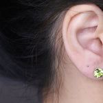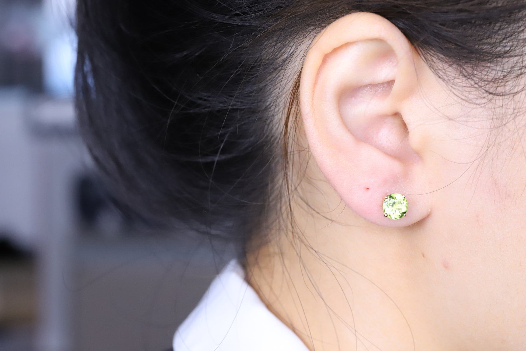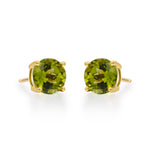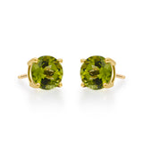 Add a bold dash of color to your look with these striking stud earrings. Each stud has a round-cut Manchurian Peridot, the vibrant green gemstone prong-set into an open basket that allows light to pass through and illuminate the color. The gorgeous studs secure with comfortable butterfly clasps. Details: Prong Setting Stud Earrings Butterfly clasps 14k Yellow Gold High polish finish Metal weighs 1.2 grams Peridot measures 7 mm Peridot weighs 2 2/5 carats Two round-cut, green peridot gemstones Earrings measure 8 mm wide x 8 mm long x 4 mm deep.
