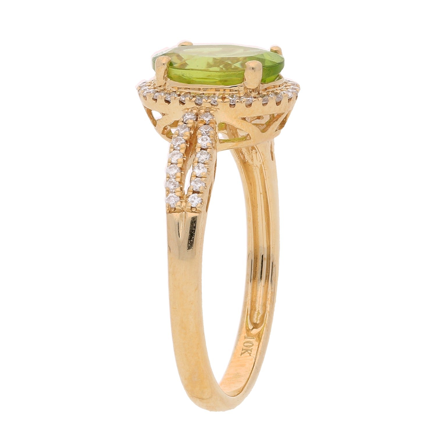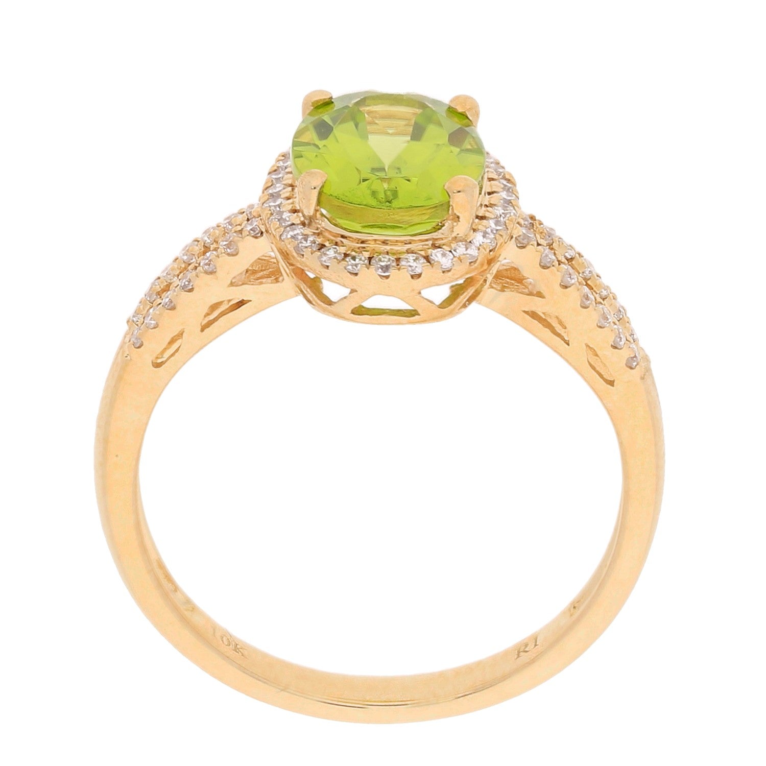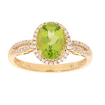 Decorate yourself in elegance with this Ring is crafted from 10-karat Yellow Gold by Gin & Grace. This Ring is made up of Oval-cut (1 pcs) 1.96 carat Manchurian Peridot and Round Cut Diamond (56 Pcs) 0.2 Carat . This Ring is weight 2.52 grams. This delicate Ring is polished to a high finish shine.