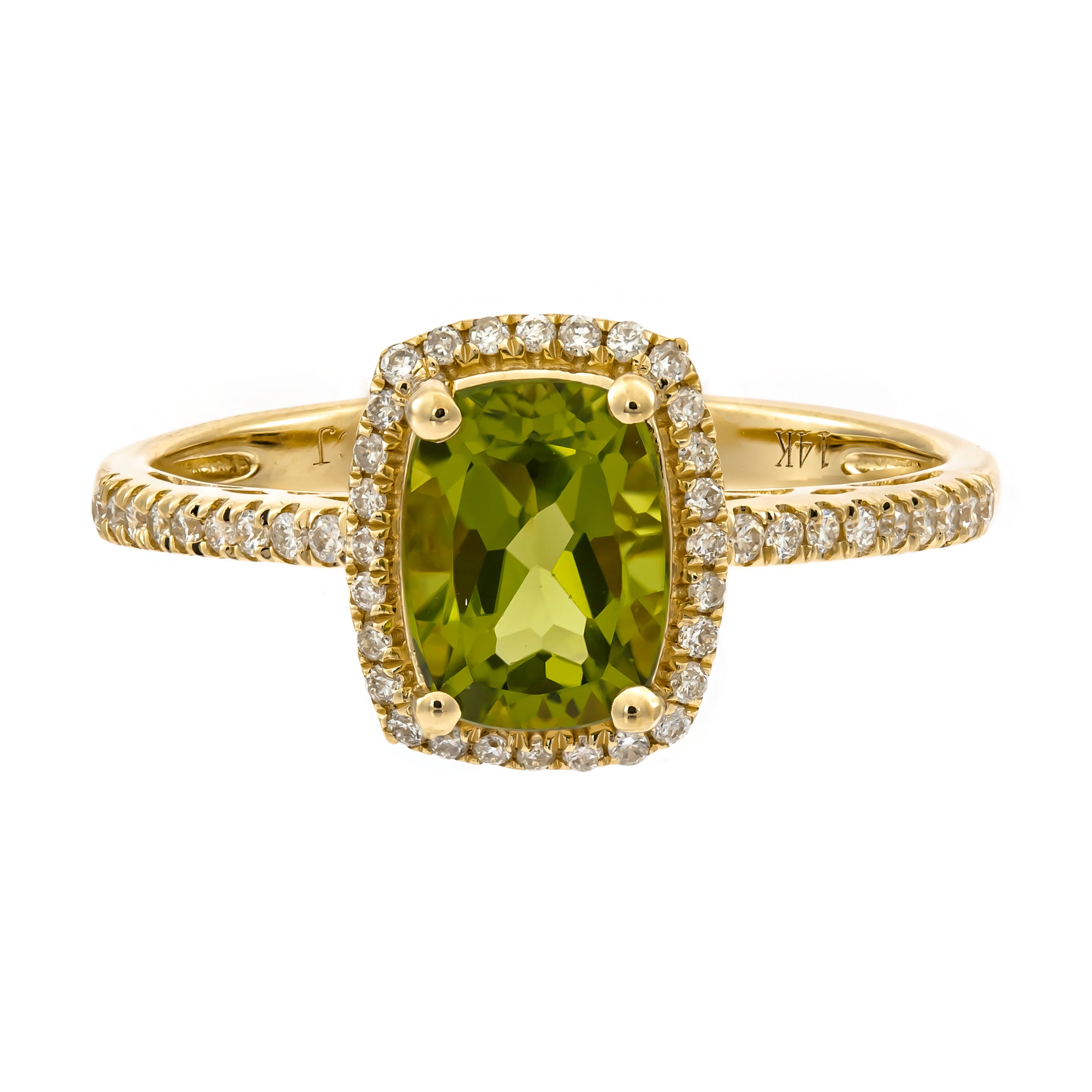 Decorate yourself in elegance with this Ring is crafted from 14-karat Yellow gold 6*8 Cushion-Cut Manchurian Peridot (1 pcs) 1.43 carat and Round-cut White Diamond (46 Pcs) 0.19 carat. This Ring is weight 2.20 grams. This delicate Ring is polished to a high finish shine.