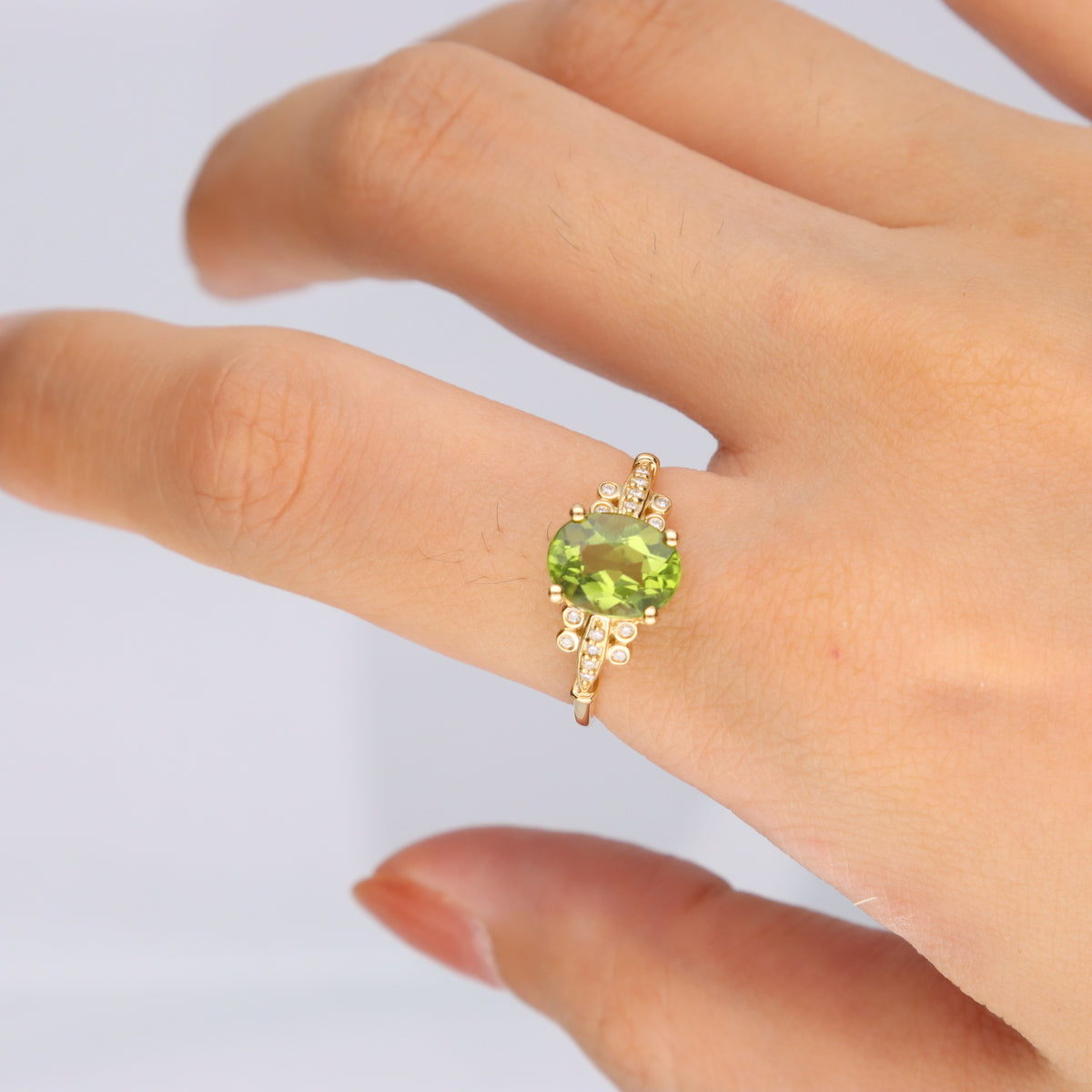 Stunning, timeless and classy eternity Unique ring. Decorate yourself in luxury with this Gin & Grace ring. This ring is made up of 7X9 mm Oval-Cut Prong Setting Genuine Manchurian Peridot (1 pcs) 2.0 Carat and Round-Cut Prong Setting Natural Diamond (16 pcs) 0.08 Carat accent stones for a lovely design. This ring is weight 2.10 grams. The ring is crafted of shining 10-karat Yellow Gold and is completed by a highly polished finish..