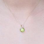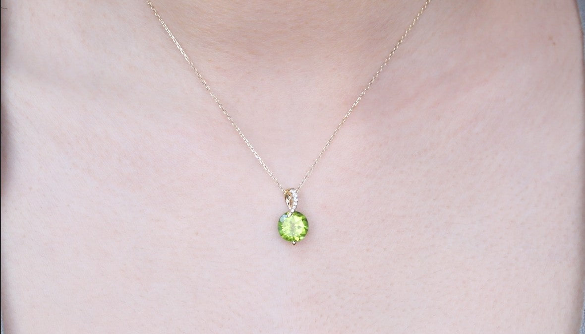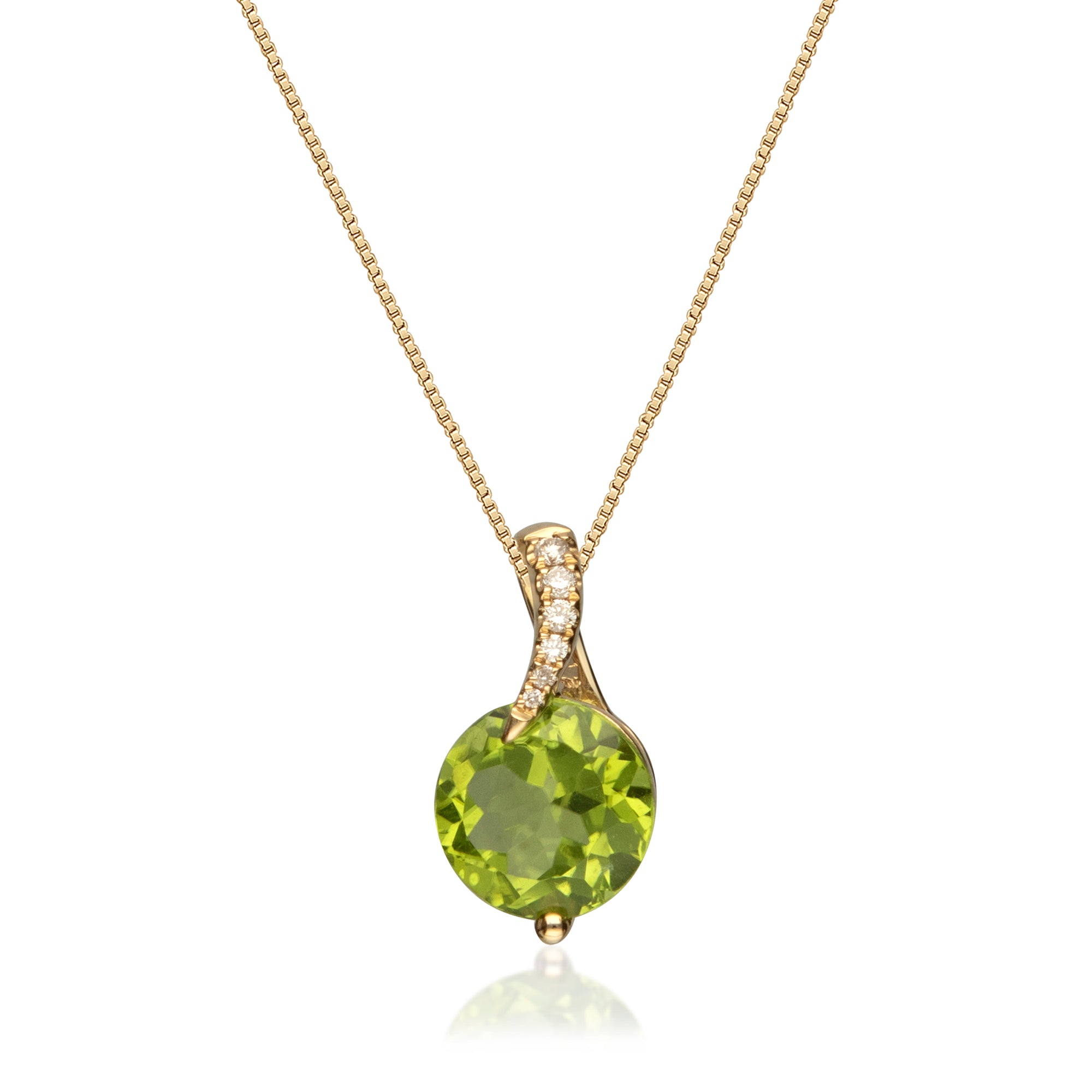 Stunning, timeless and classy eternity Unique Pendant. Decorate yourself in luxury with this Gin & Grace Pendant. The 14k Yellow Gold jewelry boasts Round-Cut Prong Setting Genuine Manchurian Peridot (1 pcs) 2.75 Carat, along with Natural Round cut white Diamond (6 Pcs) 0.05 Carat accent stones for a lovely design. This Pendant is weight 0.82 grams. Crafted with 14k Yellow Gold, this delicate Pendant is polished to a high finish shine.