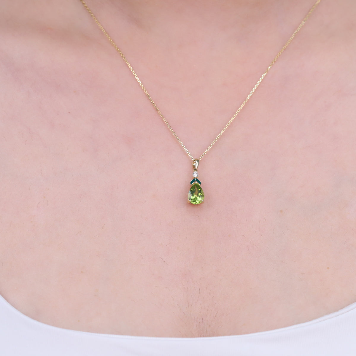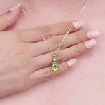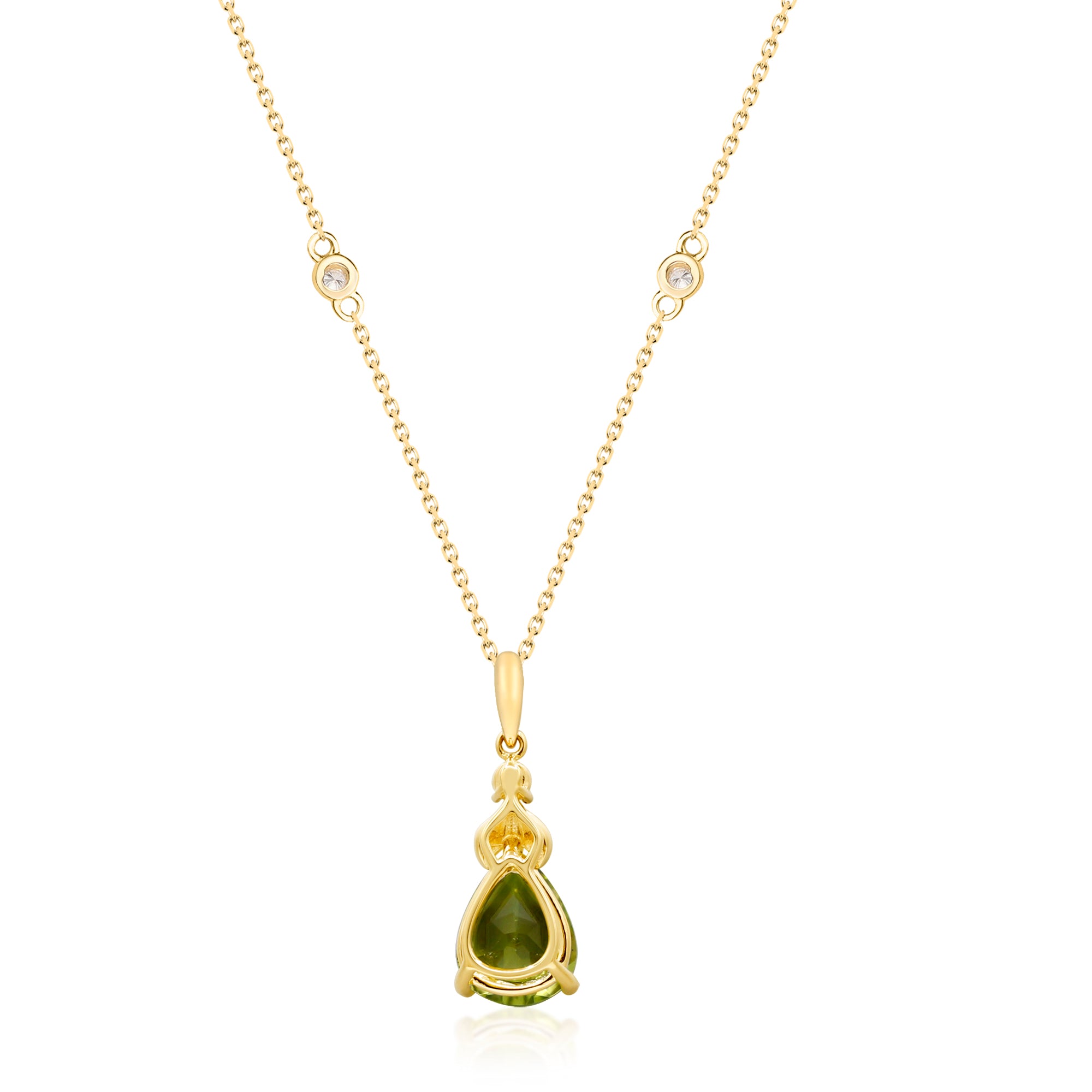 Decorate yourself in elegance with this Pendant is crafted from 10-karat Yellow Gold by Gin & Grace. This Pendant is made up of 9x7 mm Pear-Cut Manchurian Peridot (1 pcs) 1.75 carat and Round-cut White Diamond (1 Pcs) 0.07 Carat. This Pendant is weight 1.95 grams. This delicate Pendant is polished to a high finish shine.